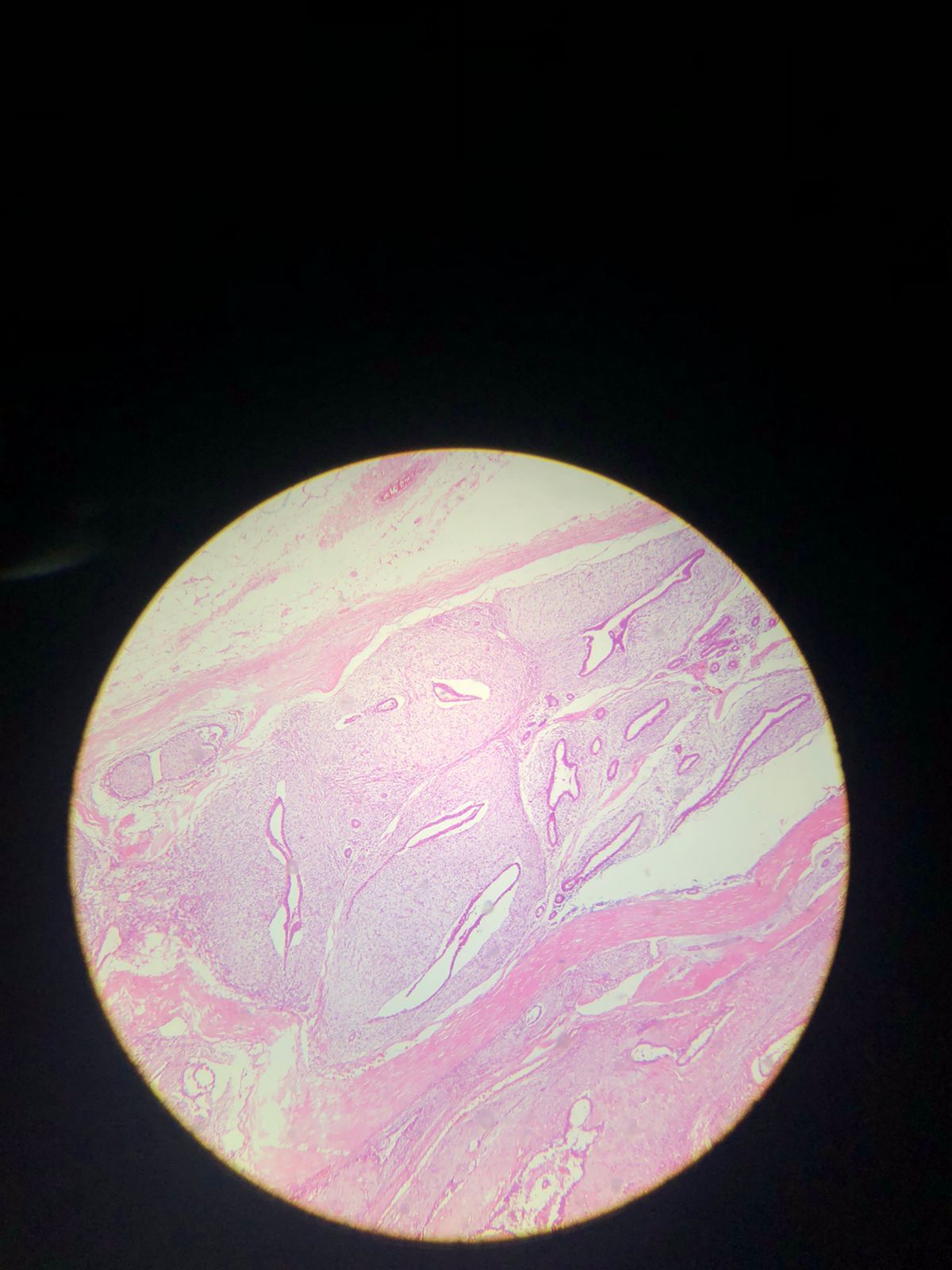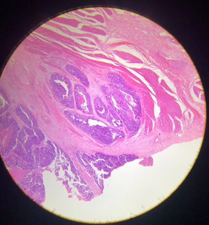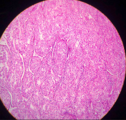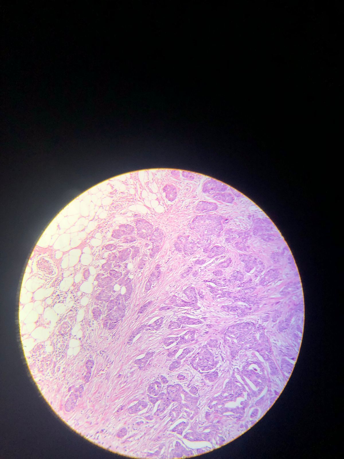 -Descrição: Células epiteliais em proliferação que se assemelham a ductos e glândulas. Formação de ilhas de células de tumor verdadeiro envolto por parênquima fibroso. Possui atipia e alta mitose na área de malignidade.
