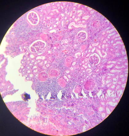-Descrição: Glomérulo hialino, presença de fibrose no córtex, espessamento da cápsula e infiltrado inflamatório crônico mononuclear.