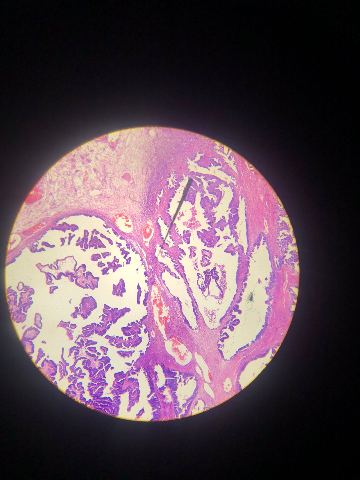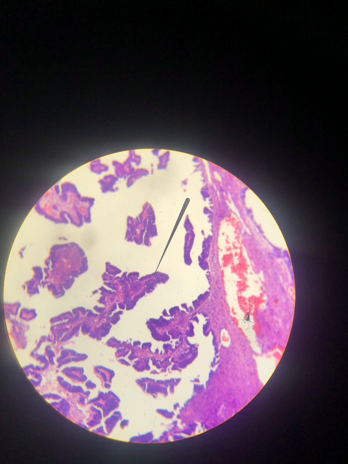 Descrição: Apresenta células colunares e secretoras de subsâncias serosas, formando projeções papilíferas na superfície do ovário e dentro das cavidades císticas, sendo isso uma característica neoplásica. Observa-se também corpo lúteo no ovário e nas cavidades císticas que estão preenchidas por material límpido, seroso com projeções papilíferas e mitoses.