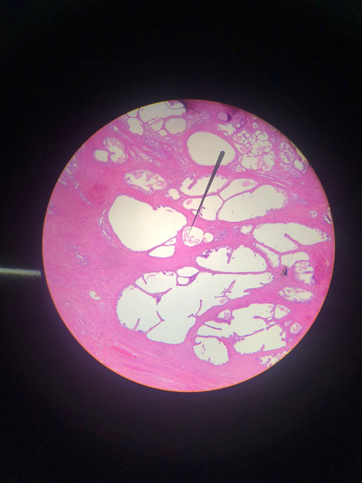 -Descrição: Amplos espaços nas glândulas prostáticas, aumento da luz das glândulas, estratificação das células das glândulas (duas camadas de células). Na região de adenocarcinoma as células são vacuolizadas. Células basais achatadas na periferia da região de hiperplasia.