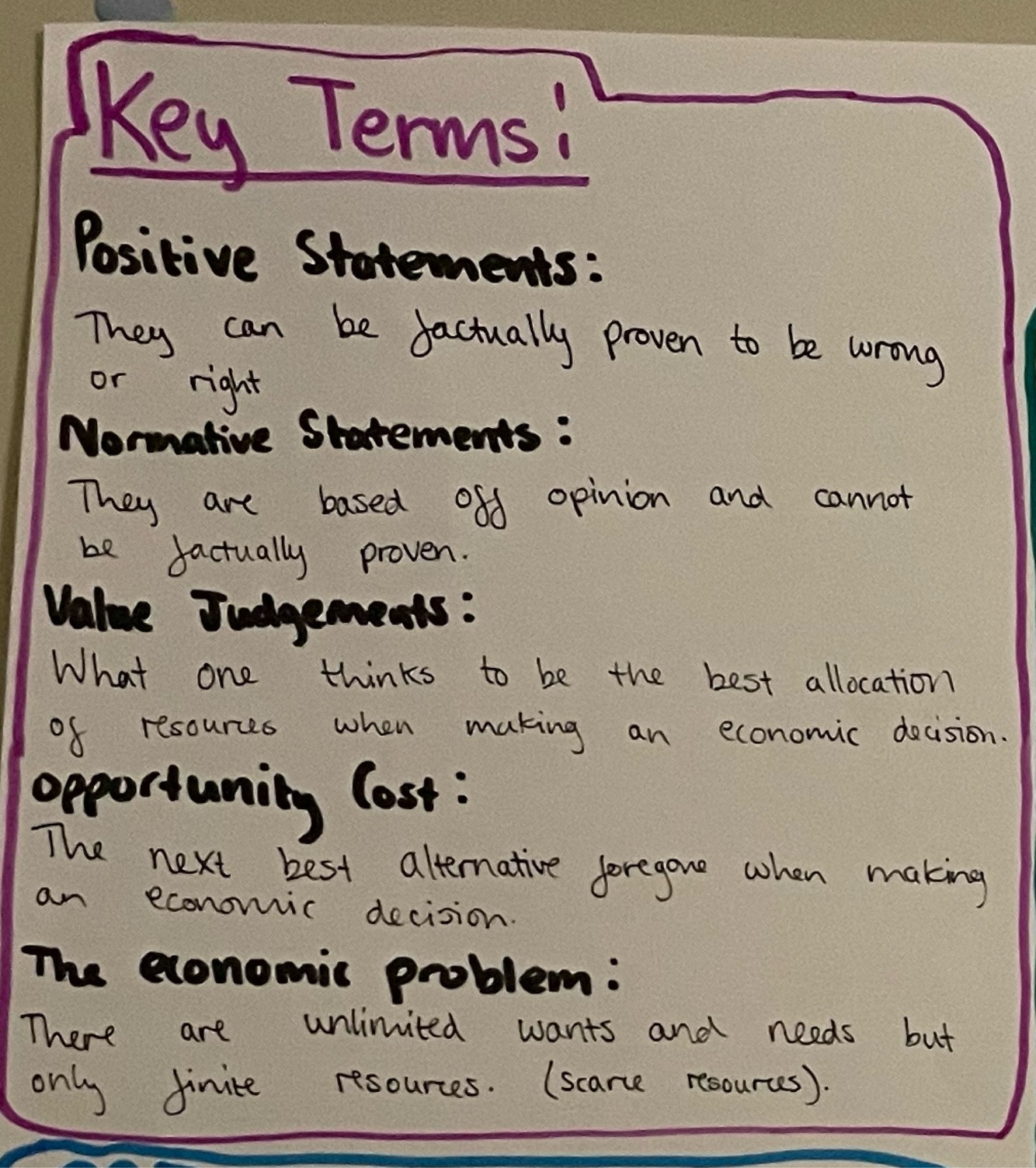 Define positive/normative statements, value judgements, opportunity cost and the basic economic problem.