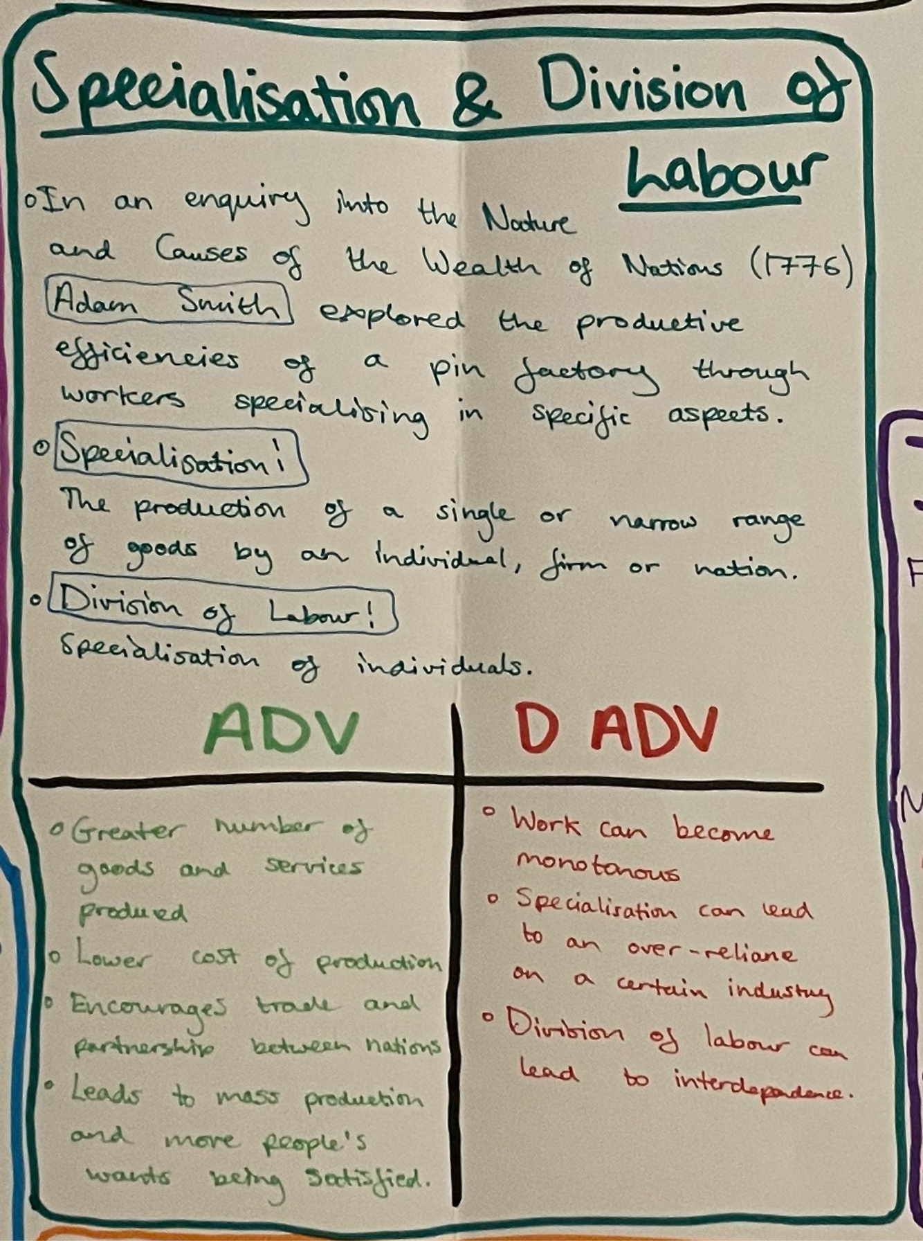 What is the name of the inquiry into specialisation and division of labour + ADV/DIS ADV and define them