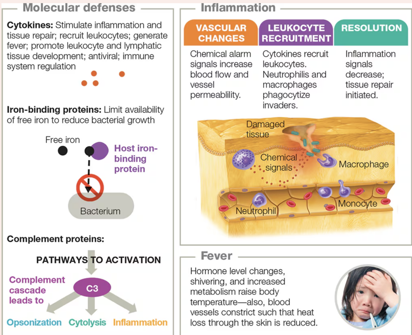 Molecular – CIC: Cytokines (inflammation, fever, recruit leukocytes, antiviral), Iron-binding proteins (hide iron from bacteria), Complement (inflammation, opsonization, cytolysis).