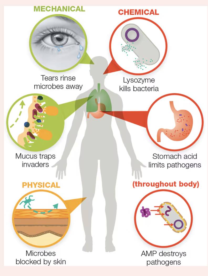 Chemical – hostile substances (lysozyme, stomach acid, AMPs)