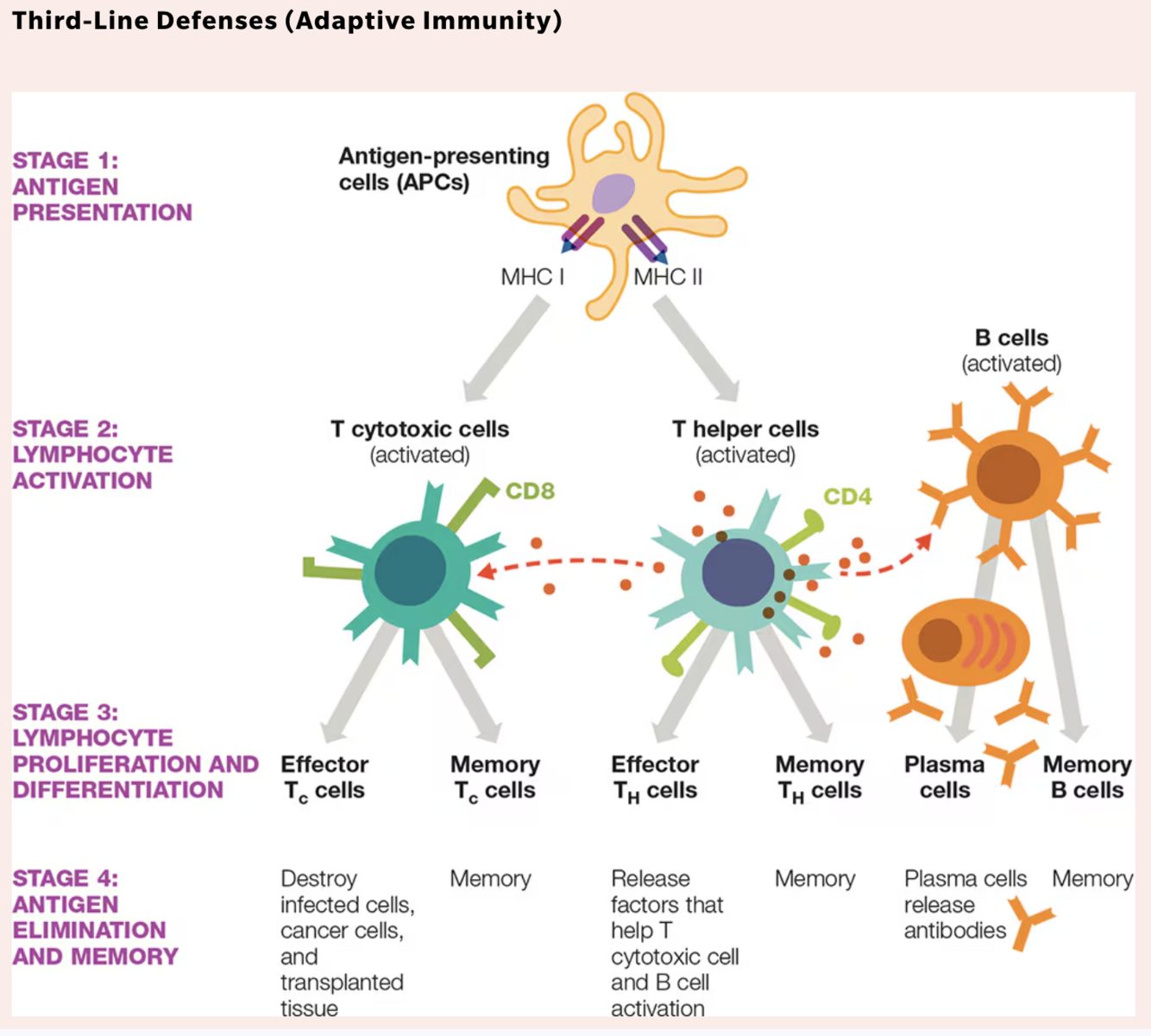 Remember A-L-P-M to walk through adaptive immunity: Antigen is shown, Lymphocytes are turned on, they Proliferate, then eliminate the antigen and leave Memory.