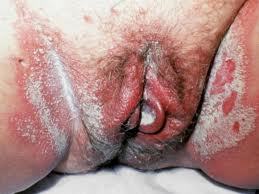 (Vulvovaginal Candidiasis = budding yeast causing white discharge + diaper-rash appearance)