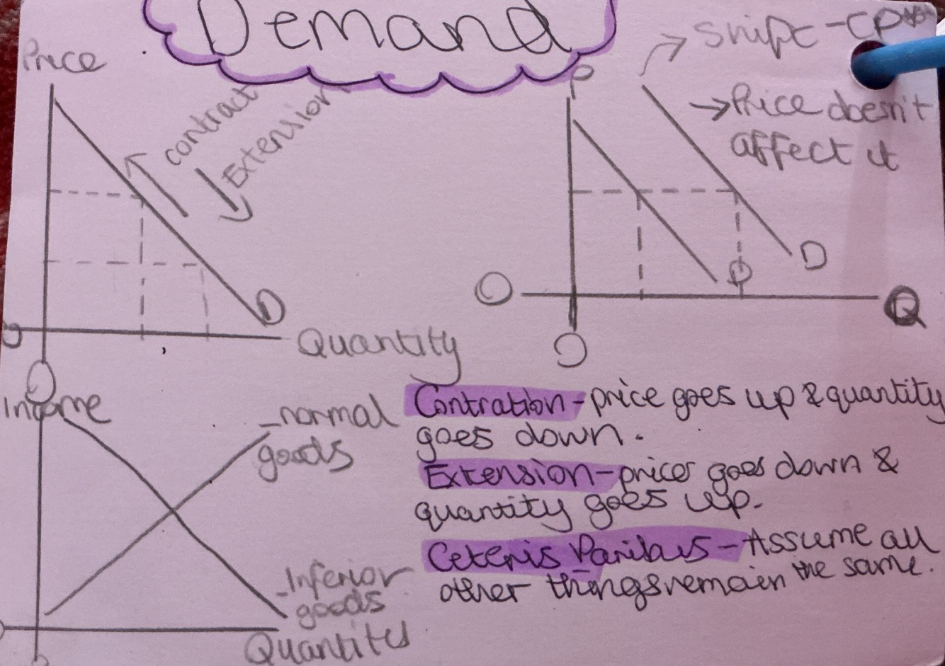 Law of demand = demand curve always slopes downward. Contraction & extension are inversely proportional.
