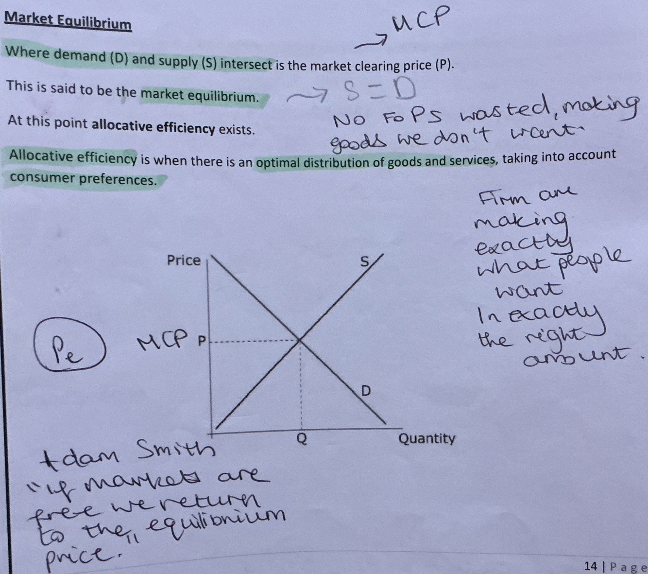 Market equilibrium- where demand and supply intersect is the market clearing price. This is said to be the equilibrium. At this point allocative efficiency exists.