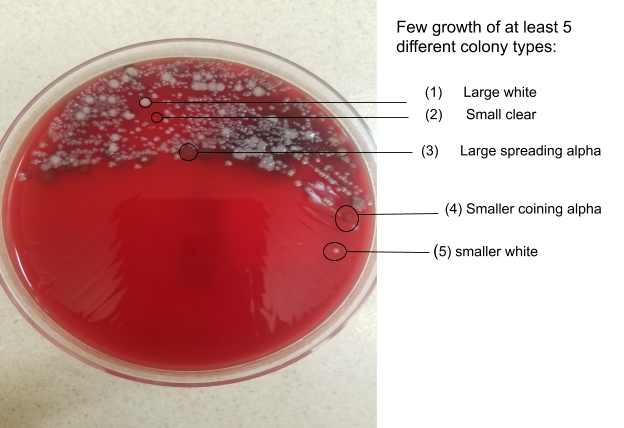 Colony Morphology: 4+, small, grey, alpha hem, umbilicate, translucent