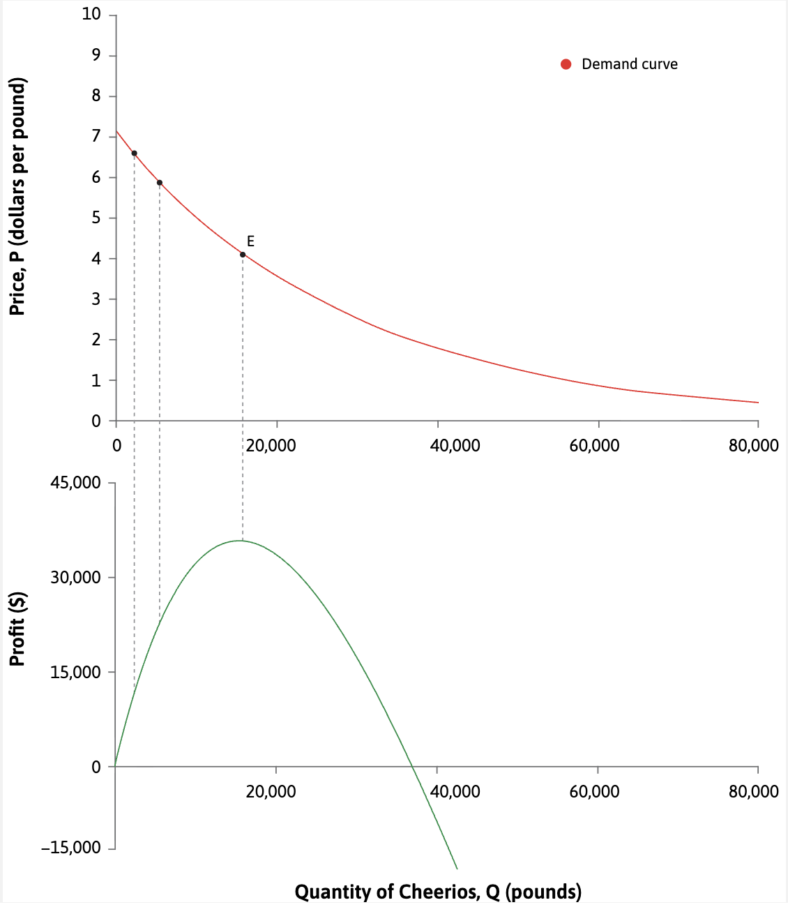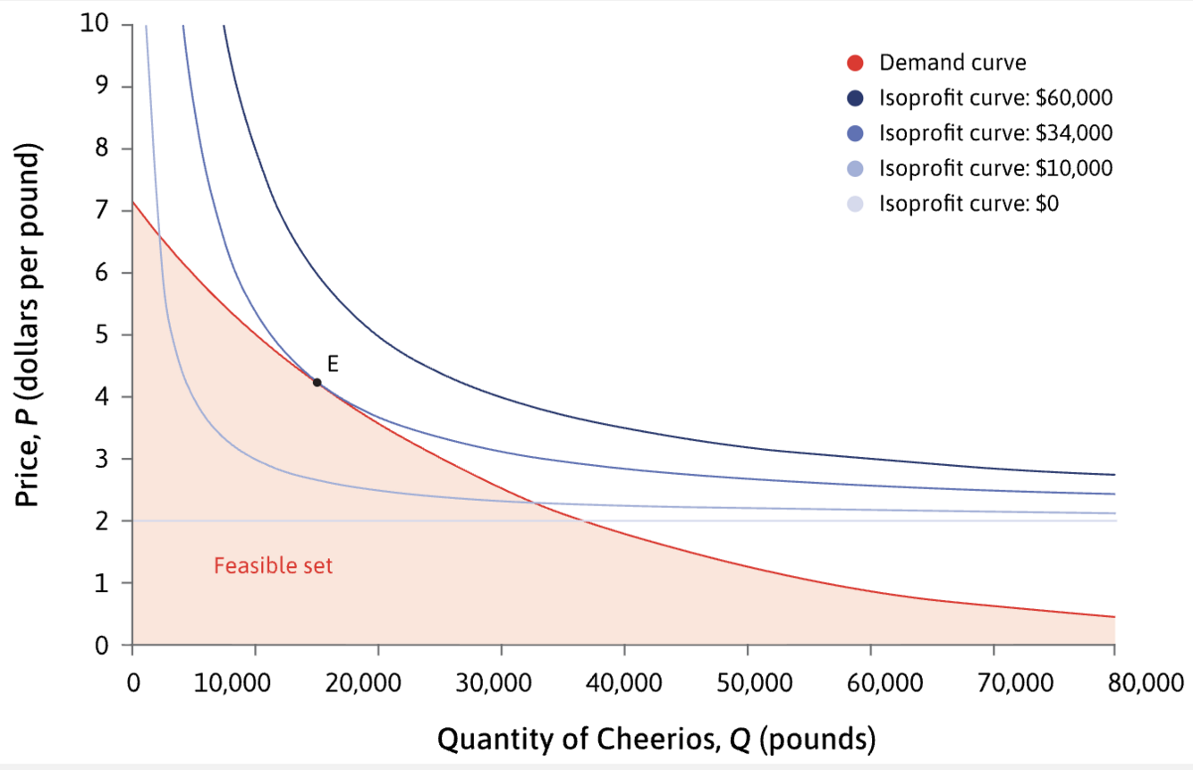 You reach the highest possible isoprofit curve inside the feasible set by choosing point E, where the demand curve is tangent to an isoprofit curve.