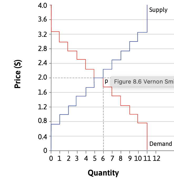 With fewer sellers and buyers what is the graph of demand and supply more likely to be drawn as, according to Vernon Smith?