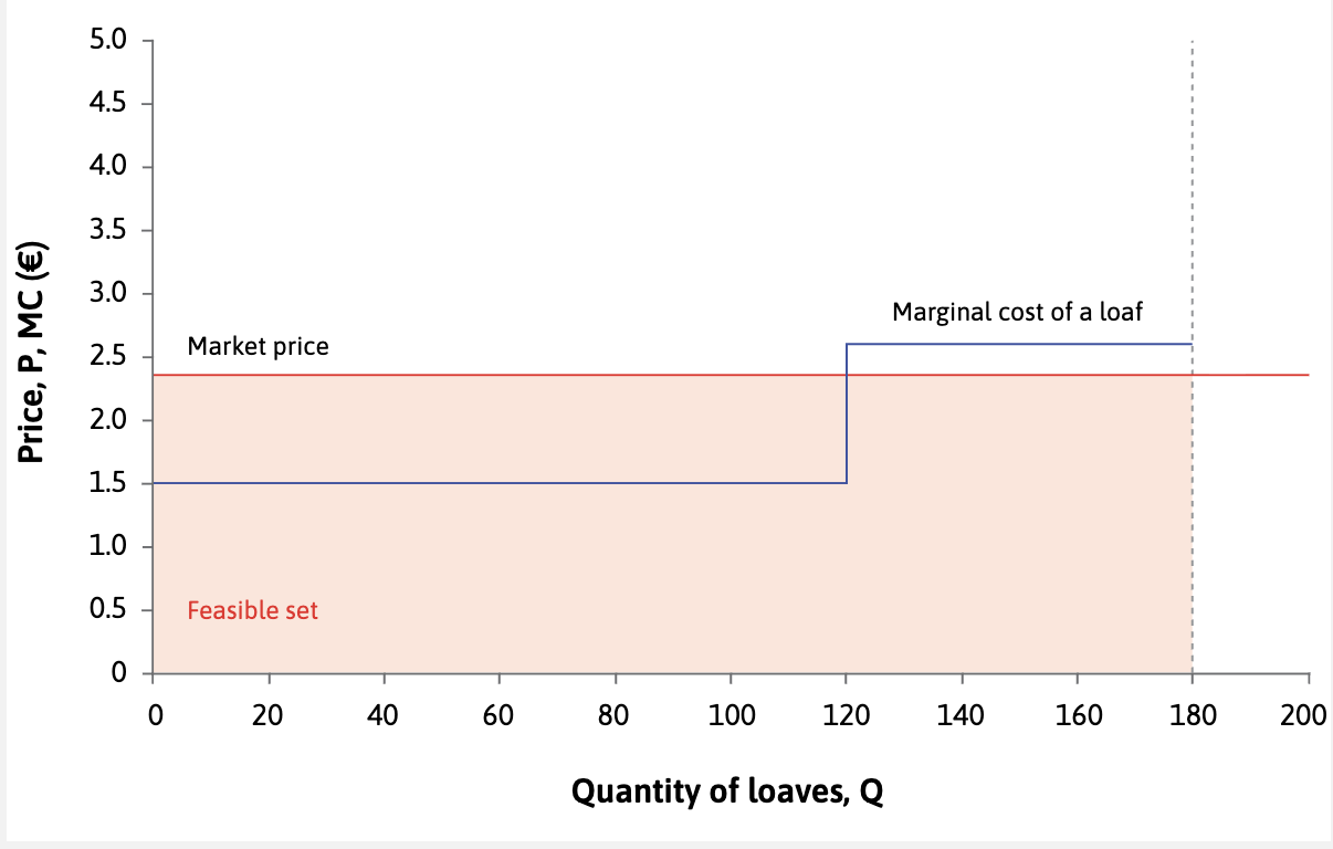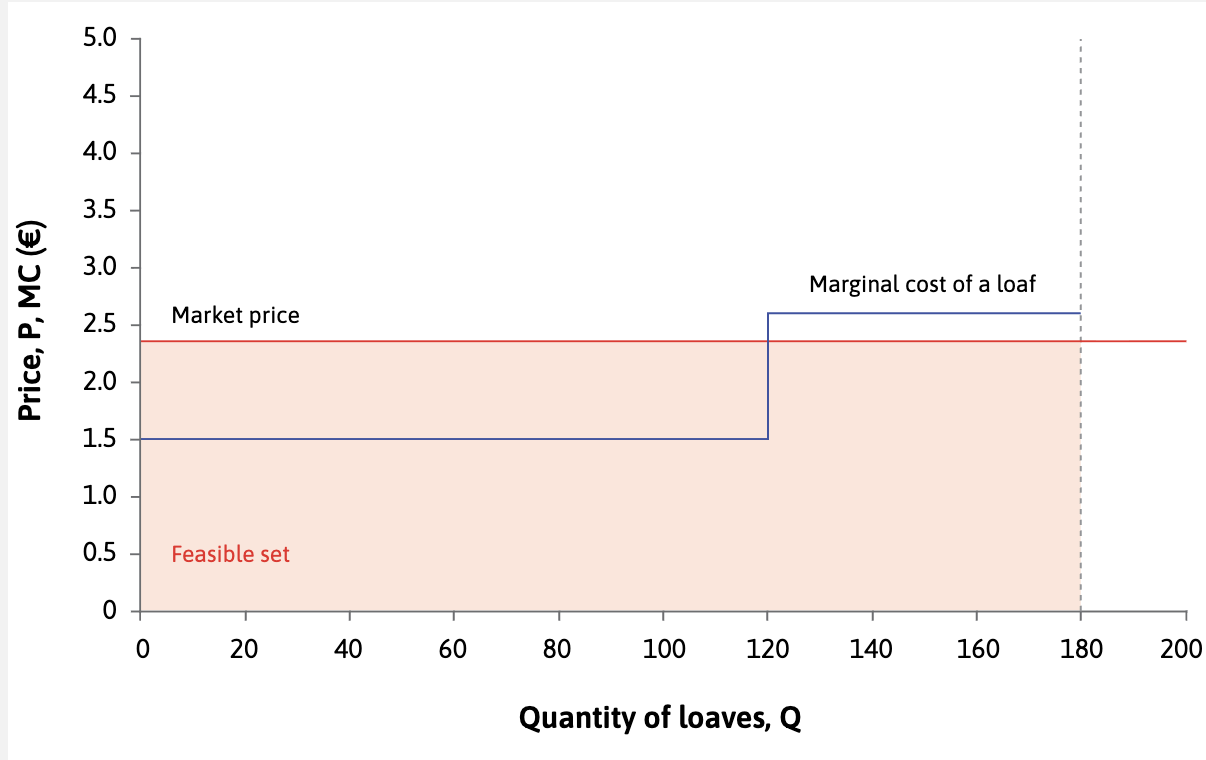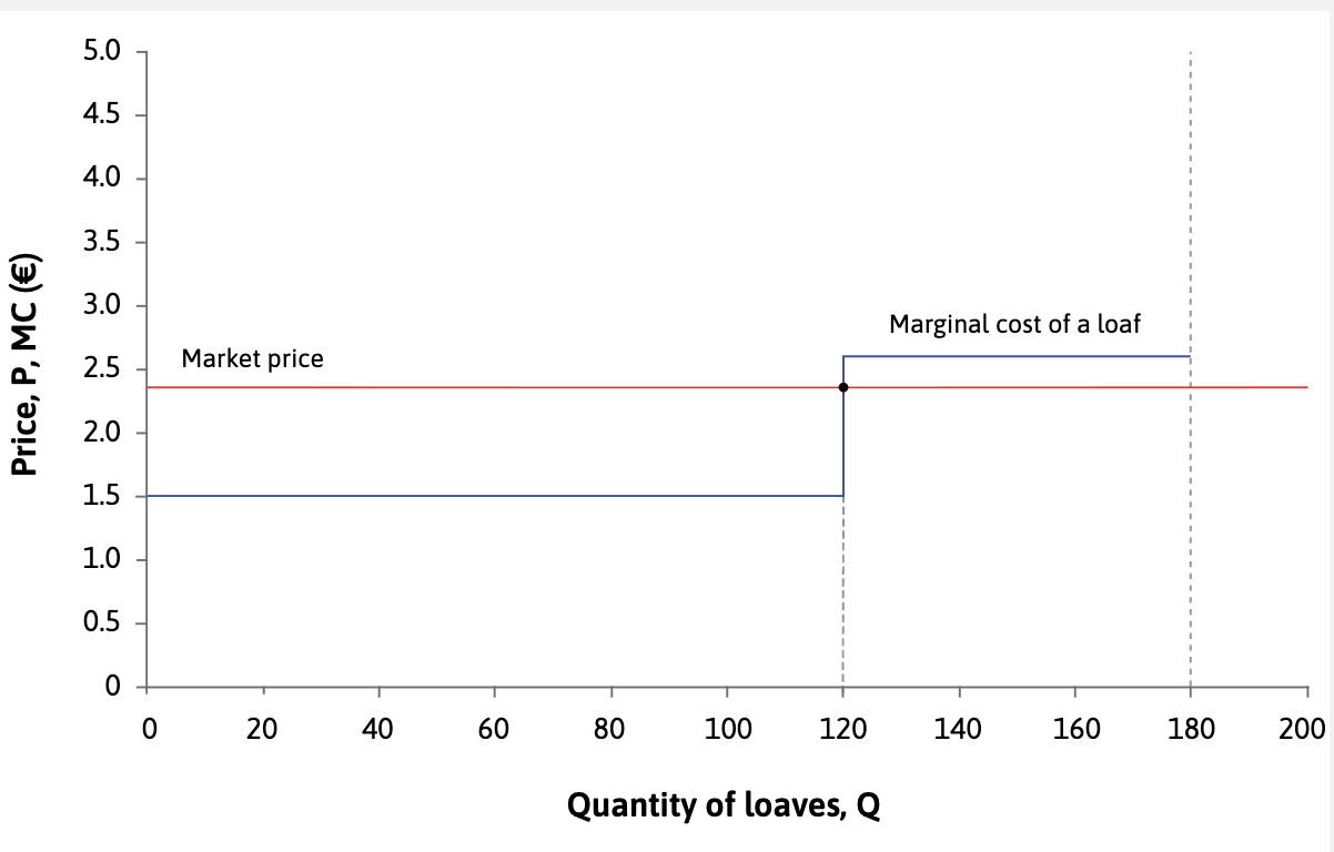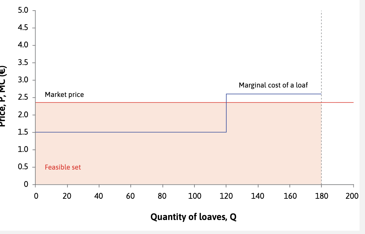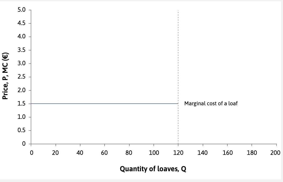 However many loaves you produce, you should sell them at €2.35 each. A higher price is not feasible, and a lower price would bring less profit.