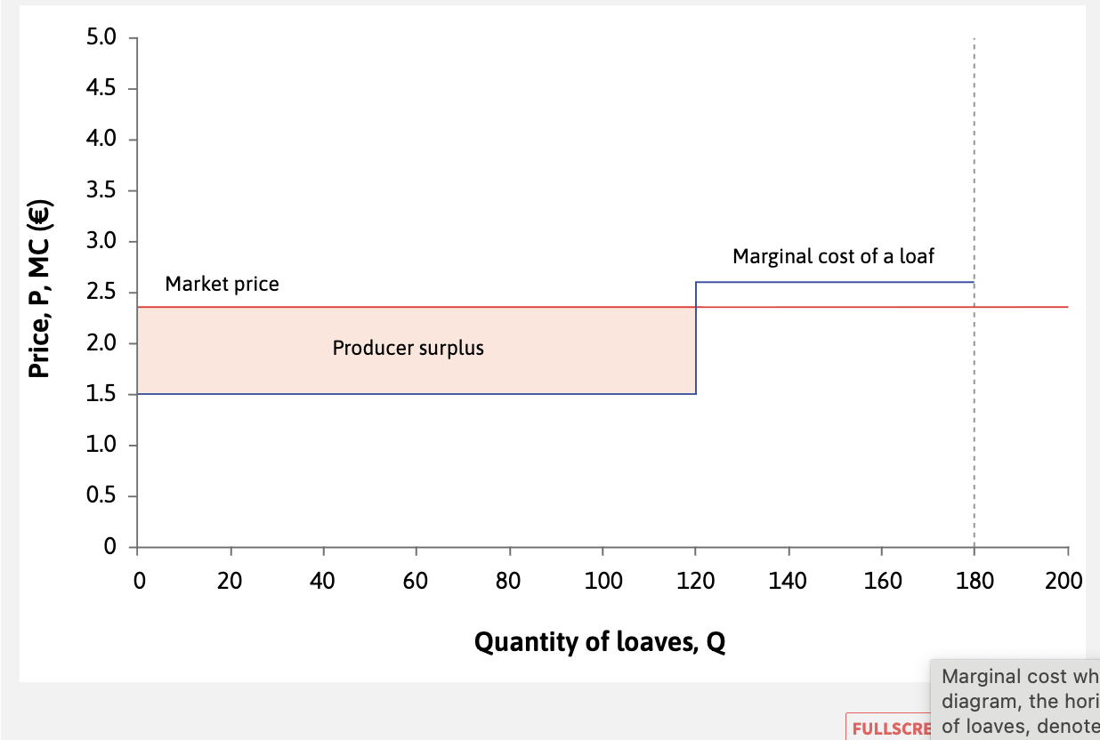 Your surplus is the shaded area between the line P = €2.35 and the marginal cost. Surplus = (2.35 − 1.50) × 120 = €102.