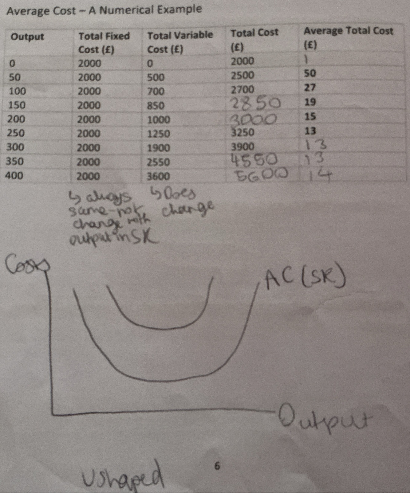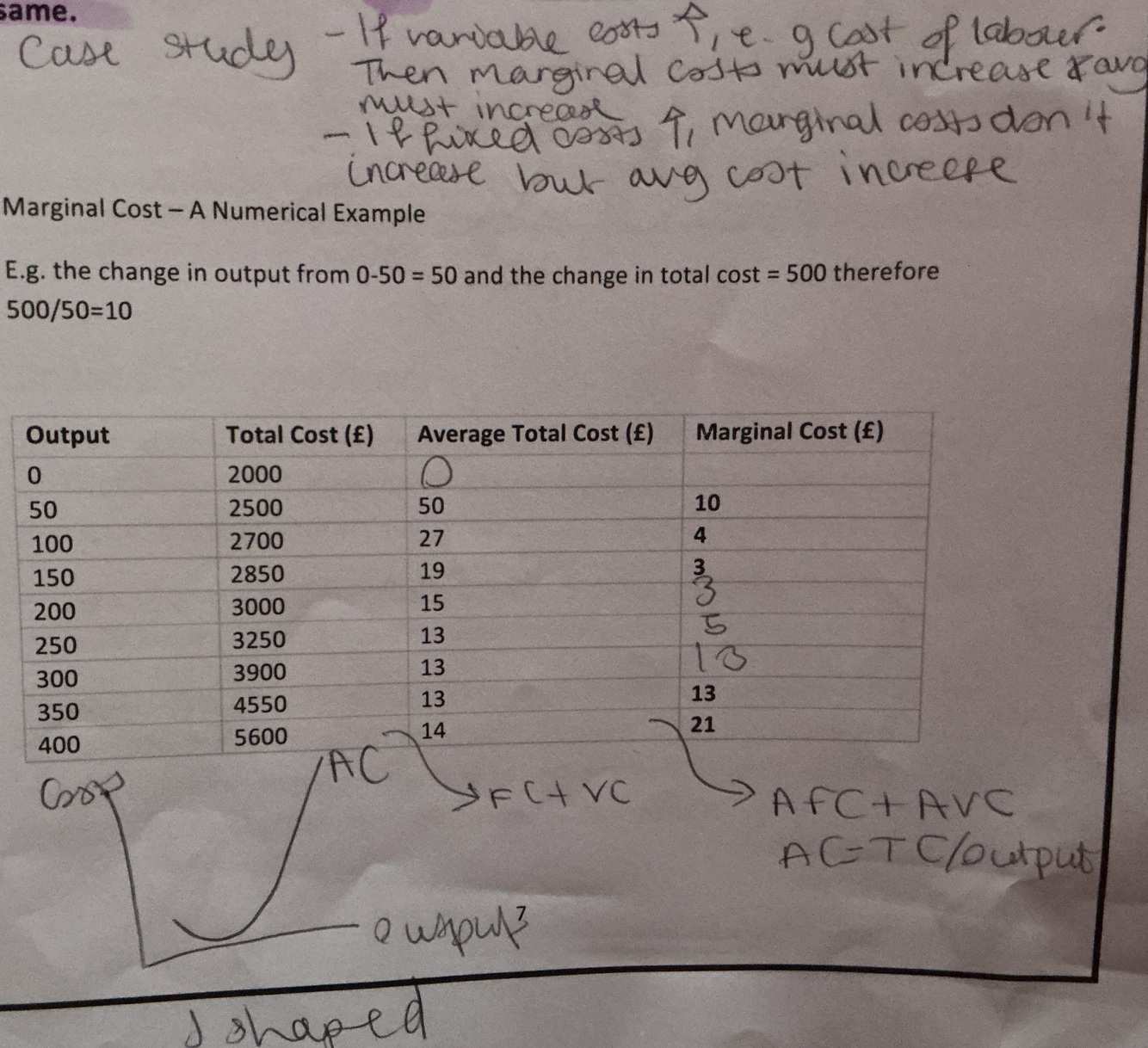 Marginal cost and average total cost (curve shape and explanation on how they interlink)