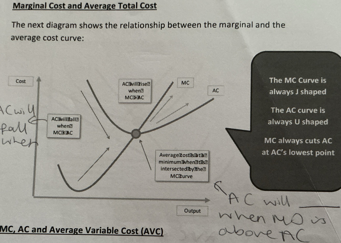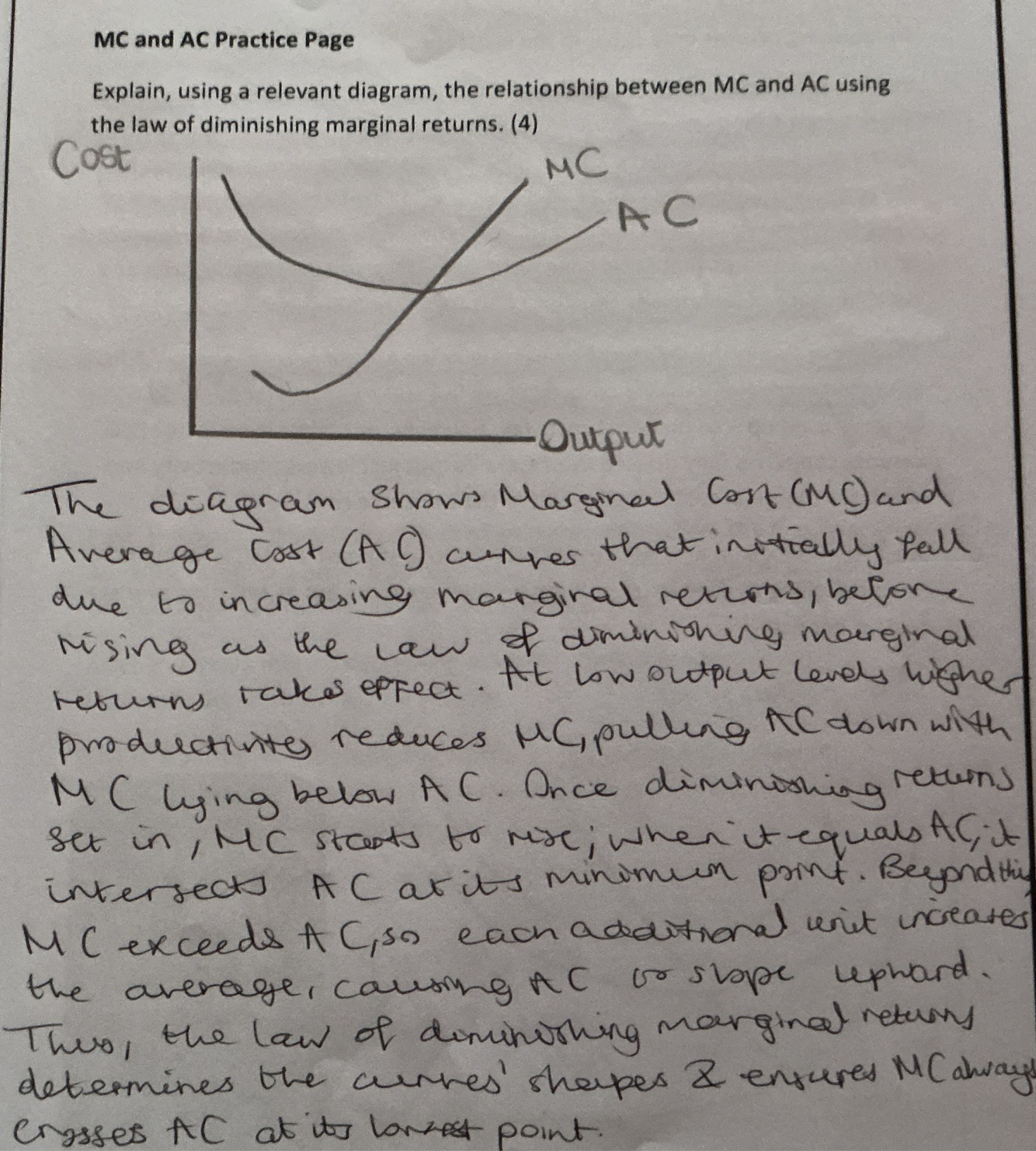 1) Both curves begin to fall. There’s increasing marginal returns at low output, productivity rises, so MC falls and lies below AC pulling AC downward