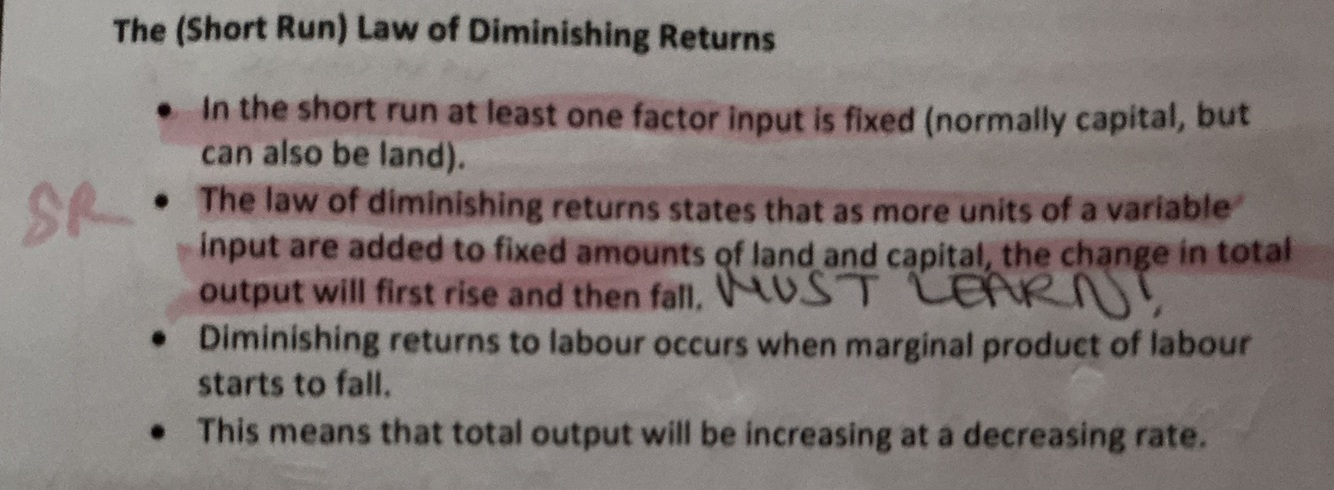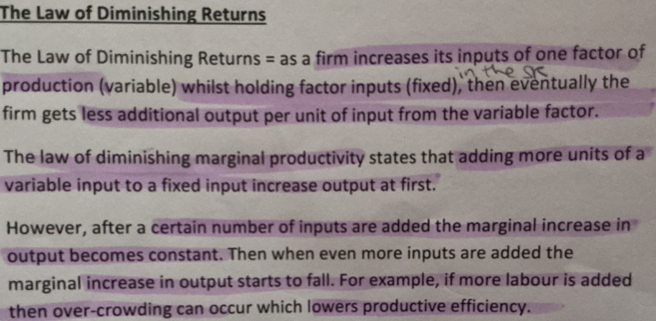 The law states that as more units of a variable factor are added to fixed factors, the extra output produced will eventually fall.