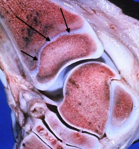 What are the arrows pointing to in this hemisected equine tarsus?