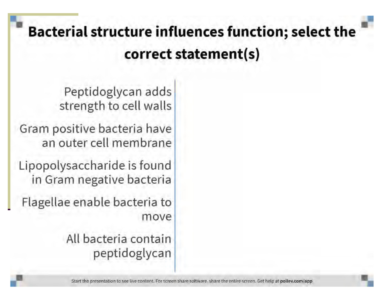 Note that some bacteria may not have cell wall –> no peptidoglycan (chlamydia, mycoplasma)