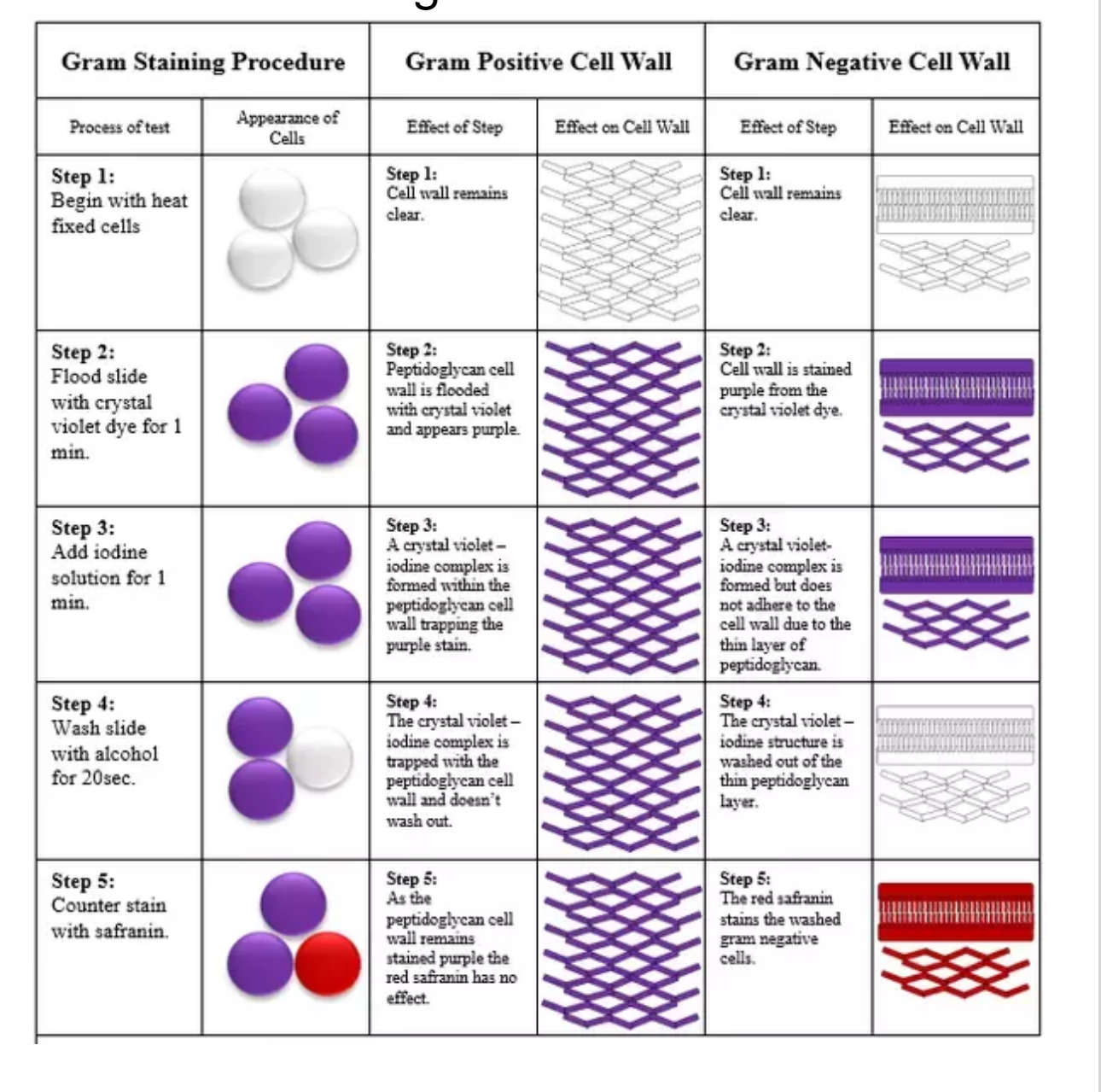 Thin peptidoglycan wall in gram negatives unable to trap crystal violet-iodine complex, hence can be washed out and counterstained with red safranin