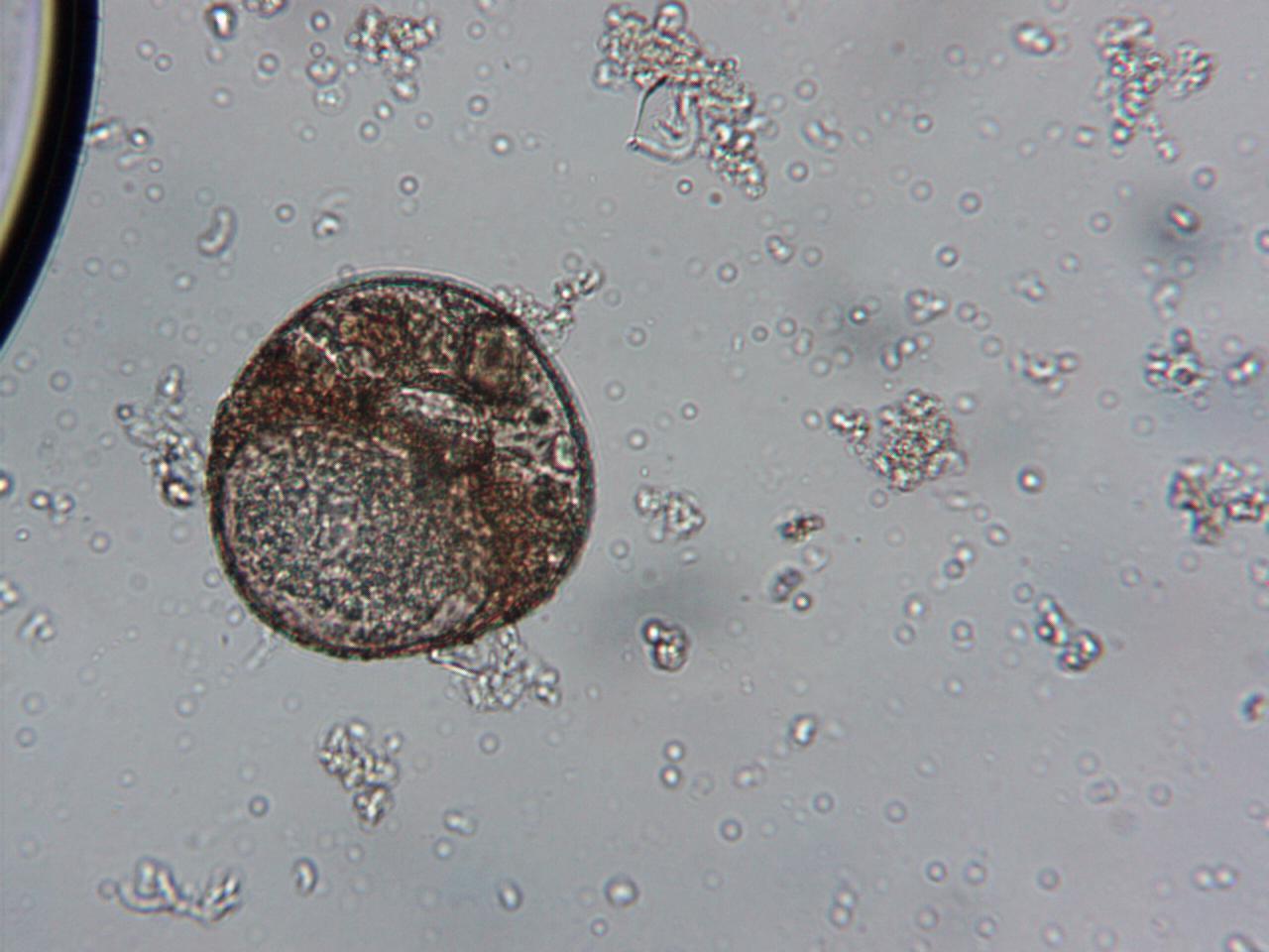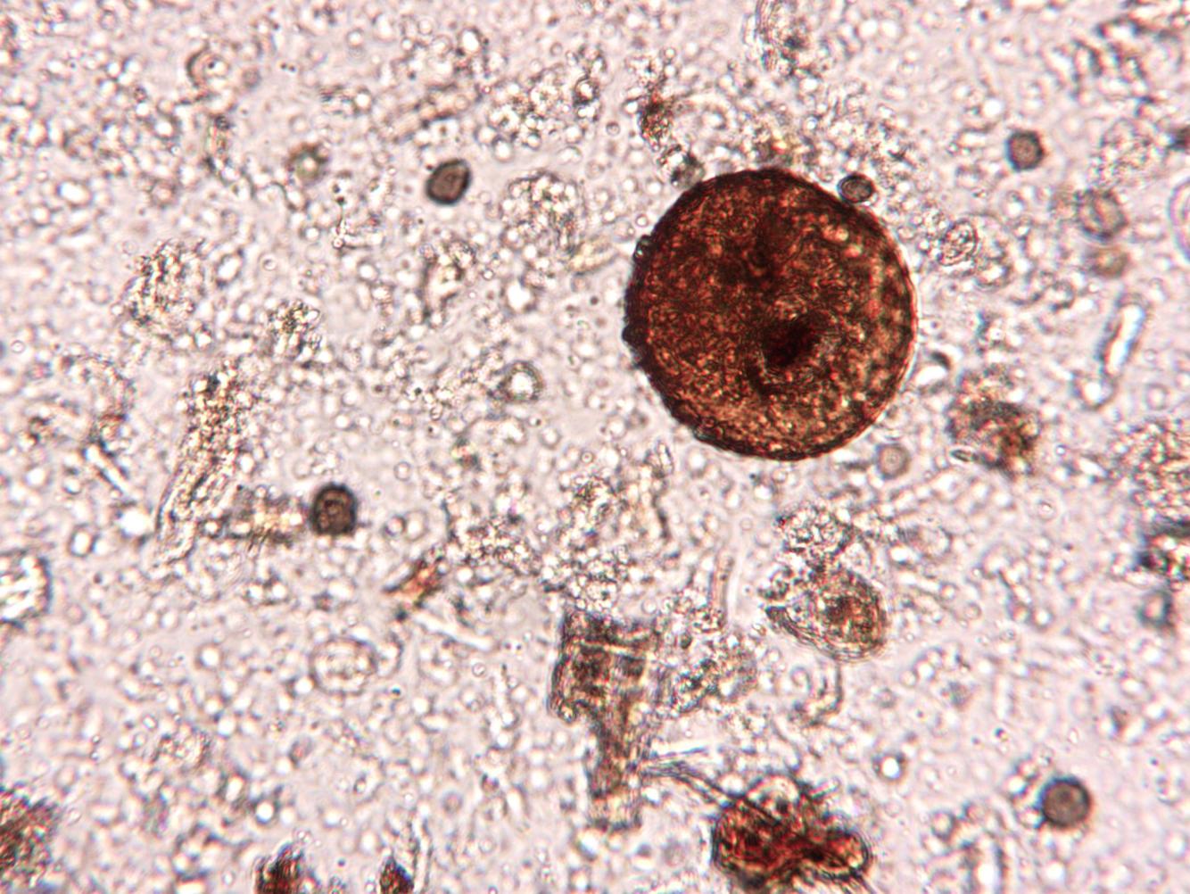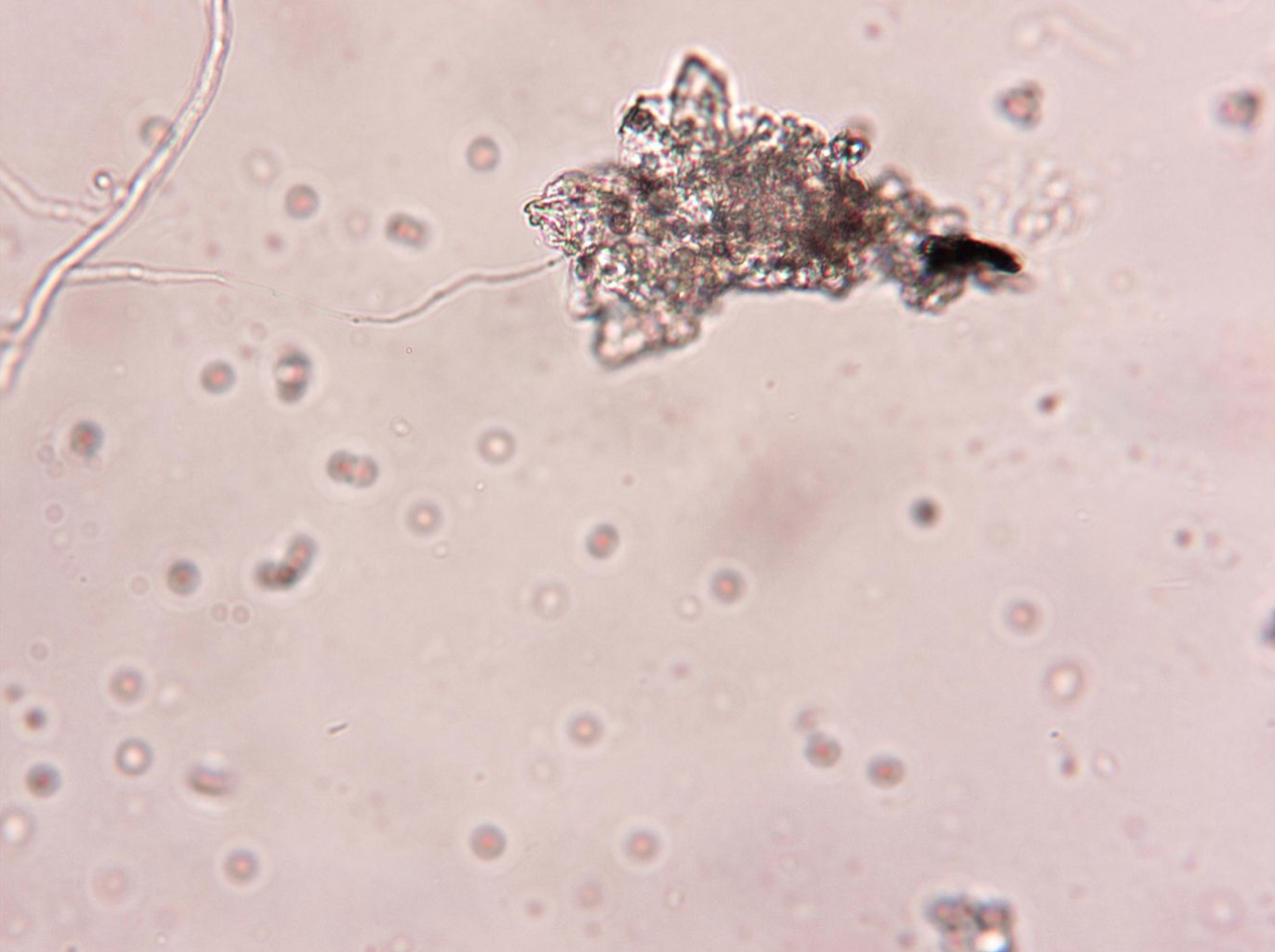 Dark spot is the opening to the test. Several fungal spores in this image. This sample should of been diluted more so that all of the organisms could of been easily identified.
