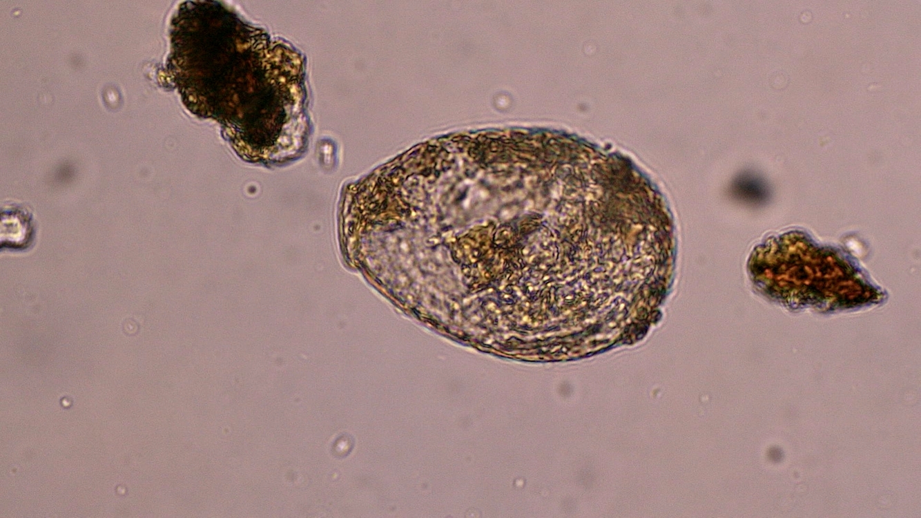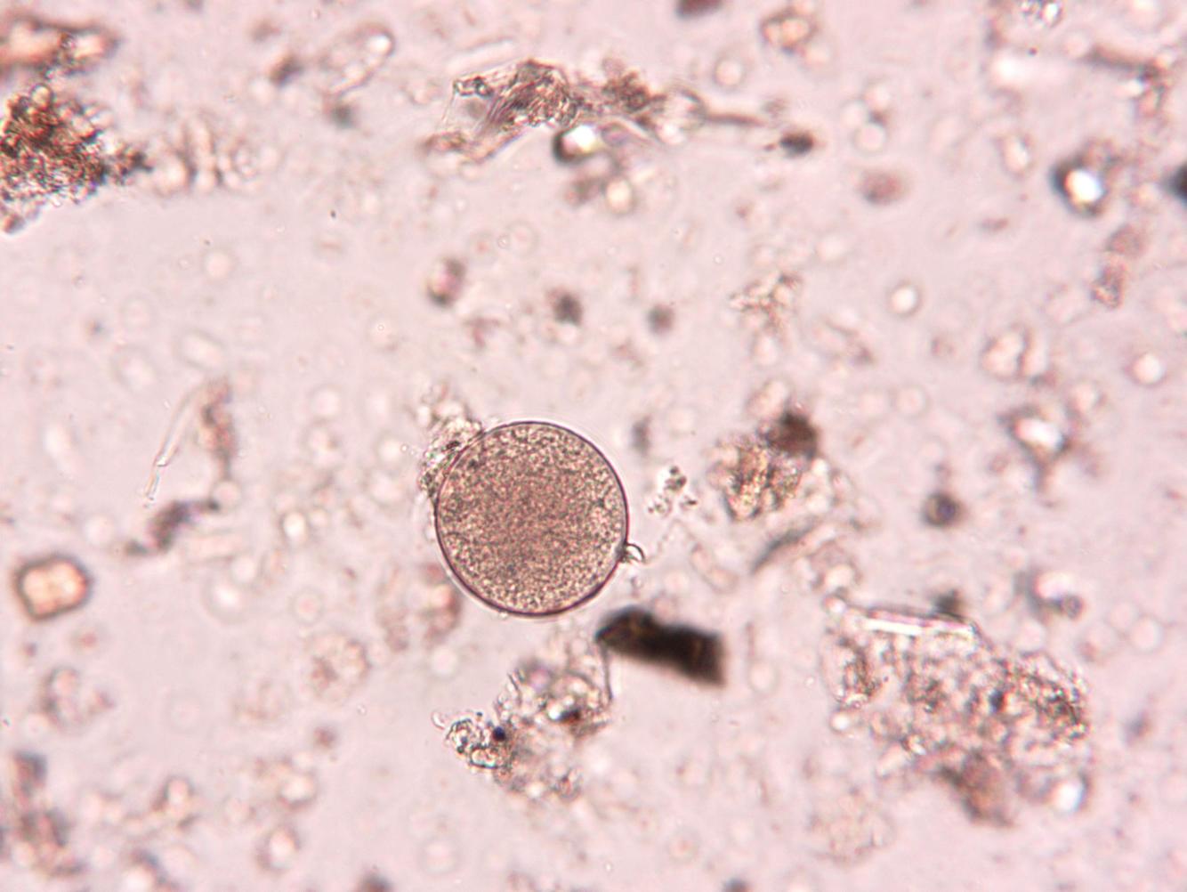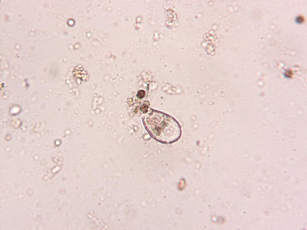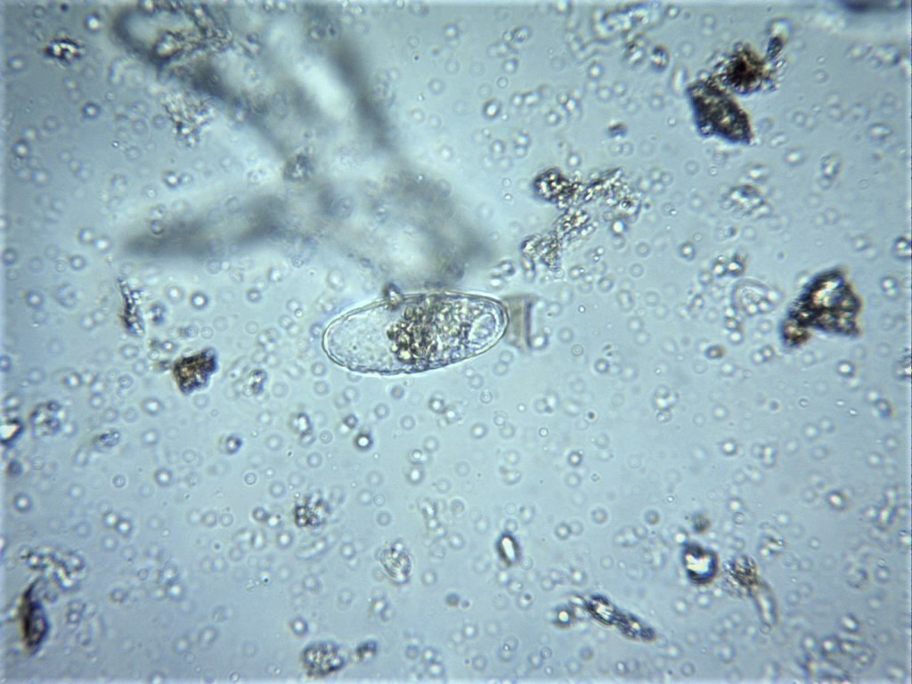 Dark spot is the opening to the test. Several fungal spores in this image. This sample should of been diluted more so that all of the organisms could of been easily identified.