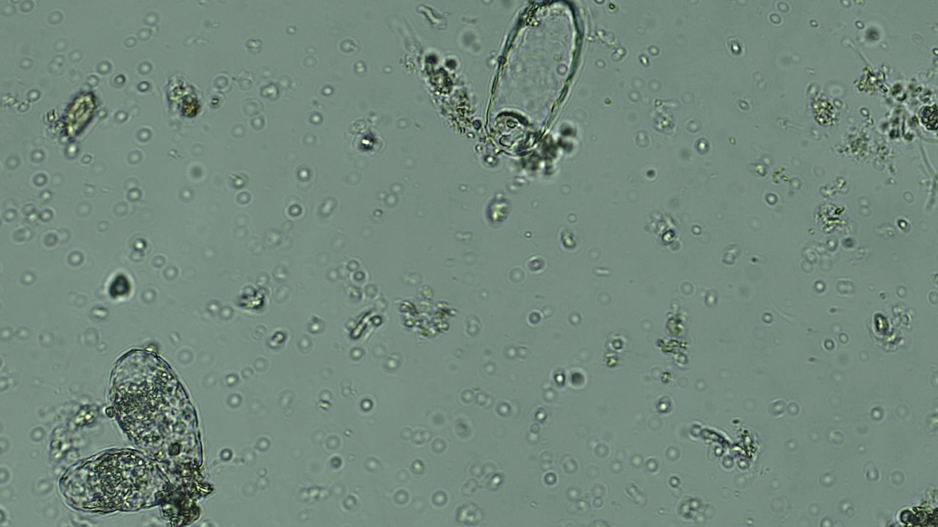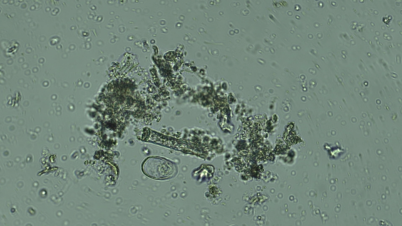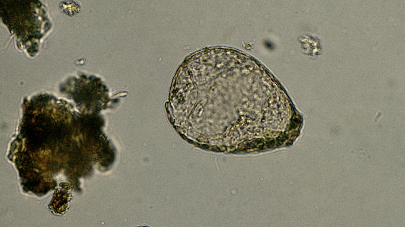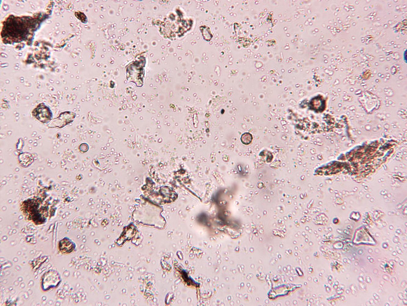 Several mineral pieces in this sample with sharp edges and clear reflective surfaces. There is a spore to the right of center in this image. Find center of photo and move about a inch to the left you will find the flagellate. Potential cyst on left. Would need focus control to confirm it is a cyst and not an air bubble.