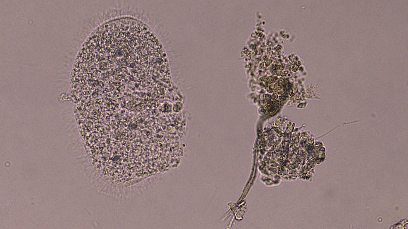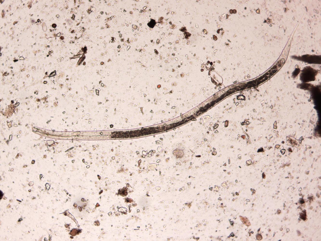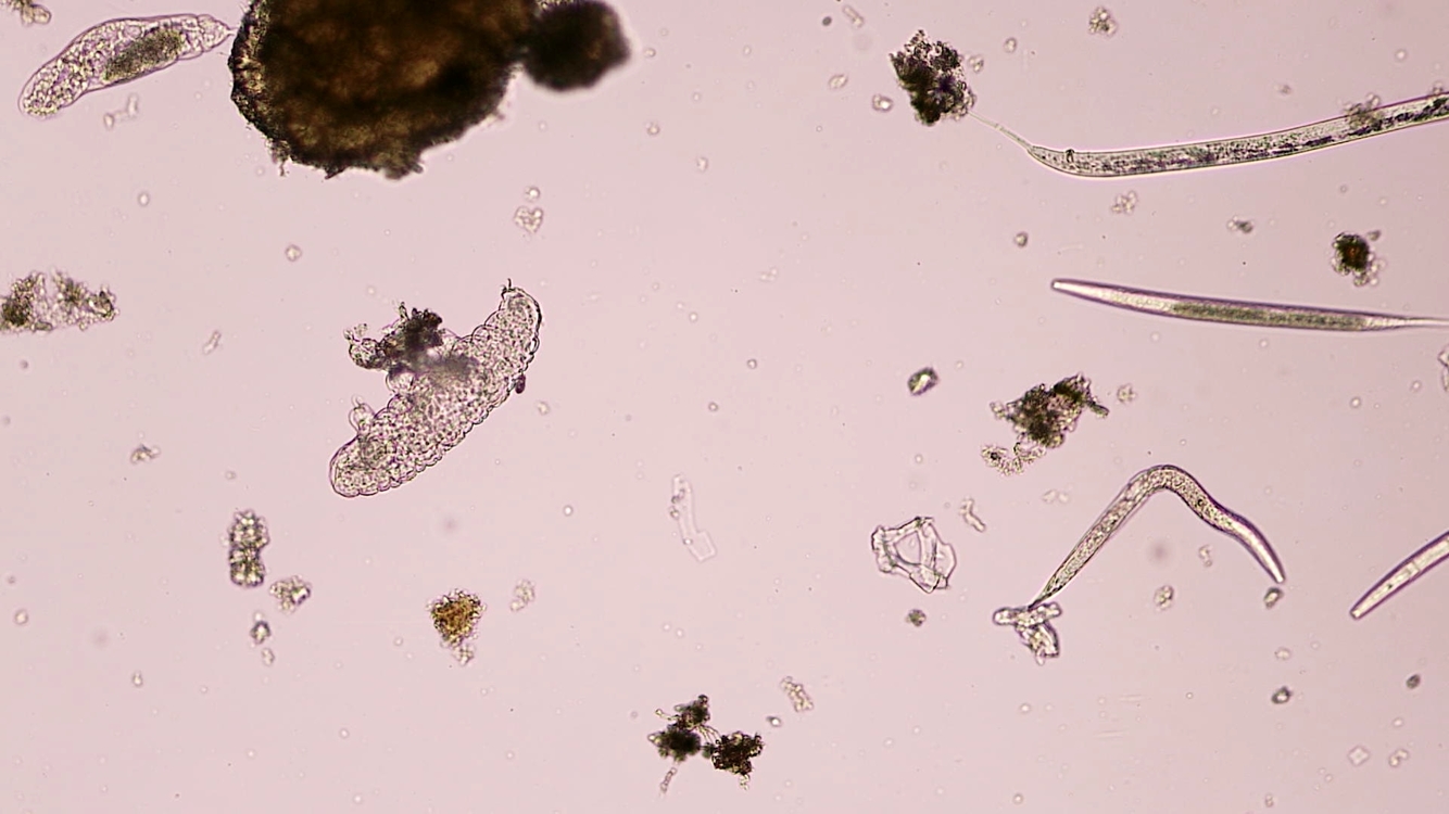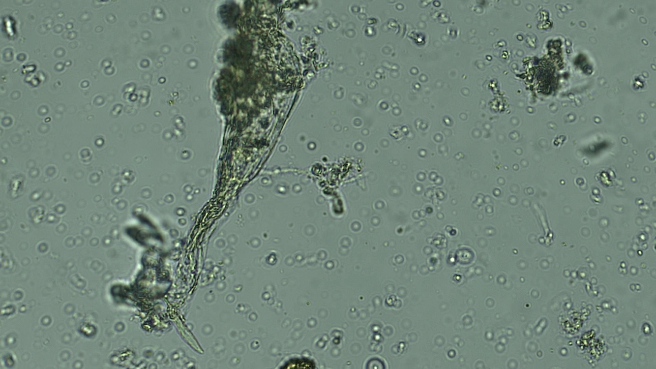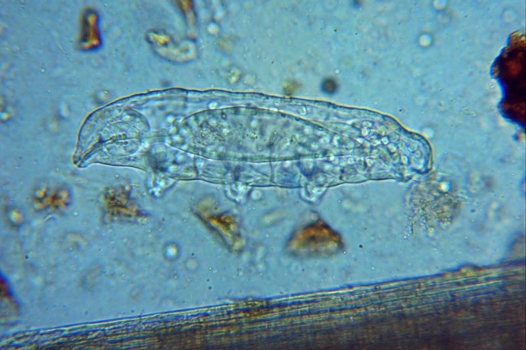 Rotifer is attached to OM in the top left of photo. Tardigrade is in the center, you can see its feet and claws. Nematodes to the right