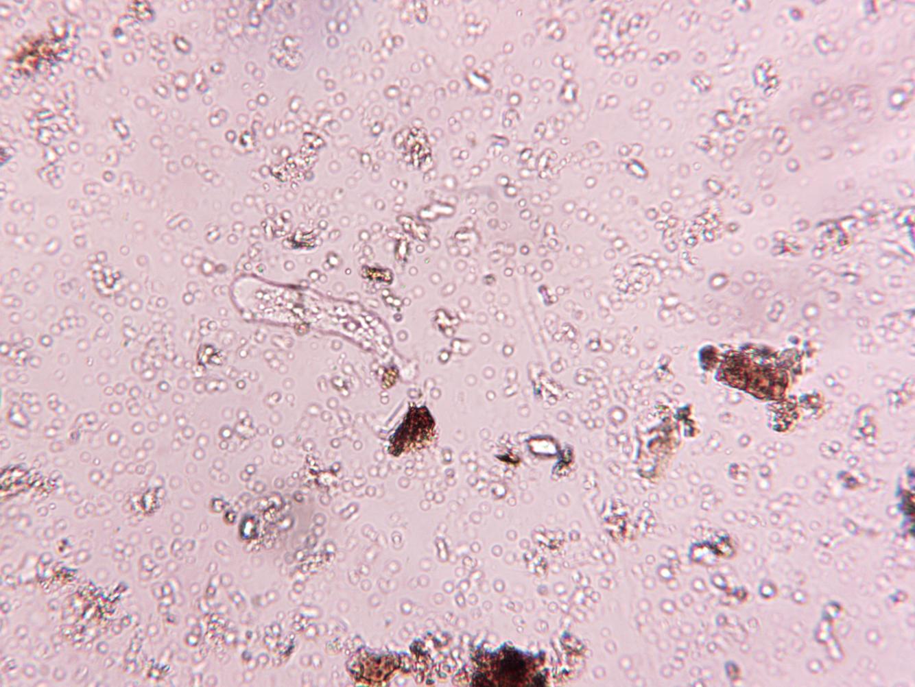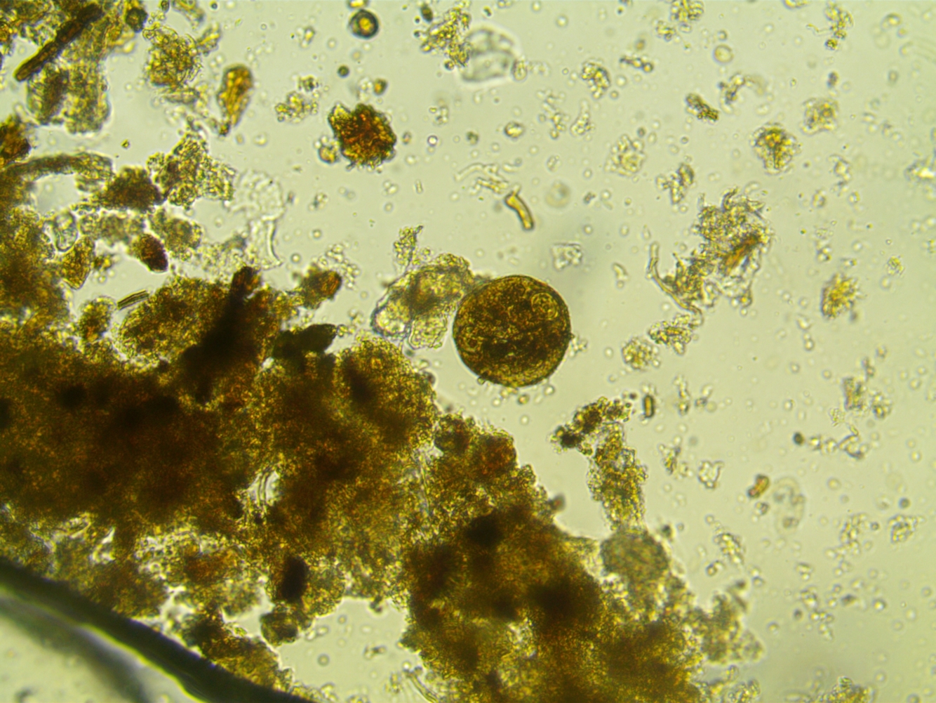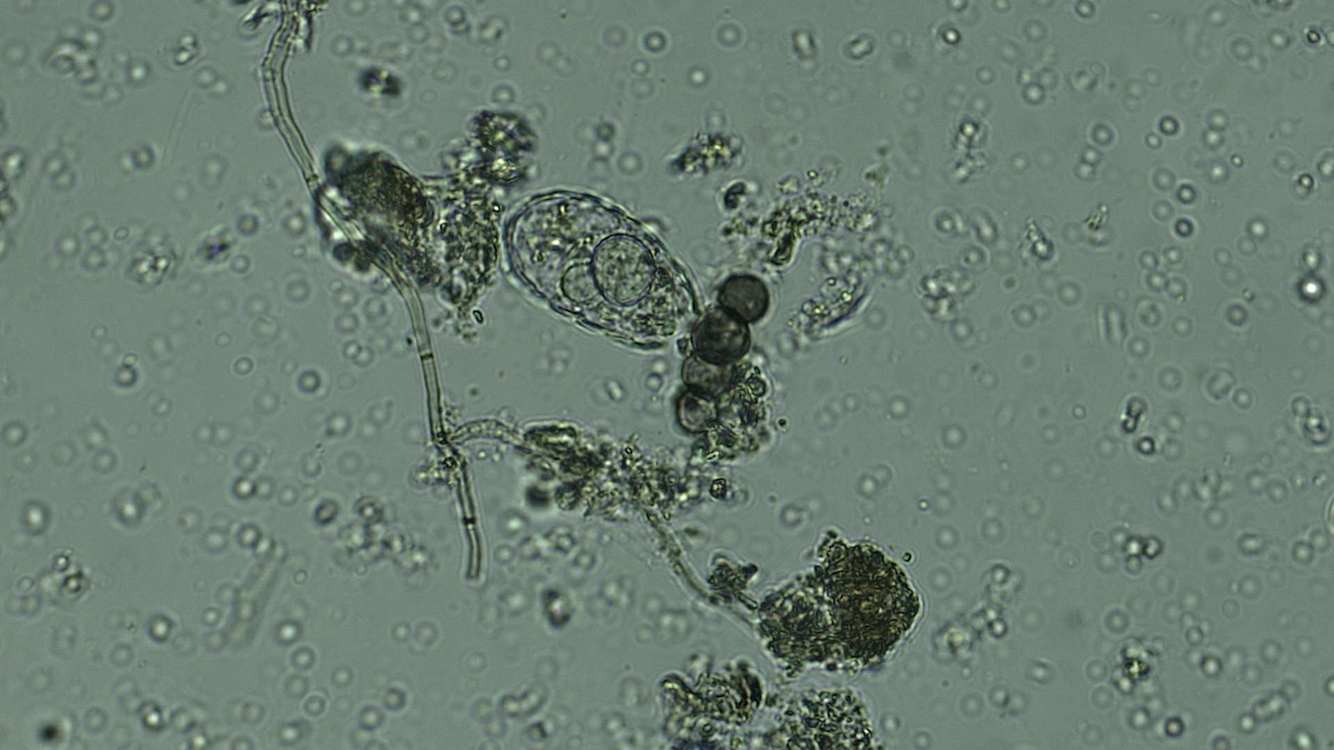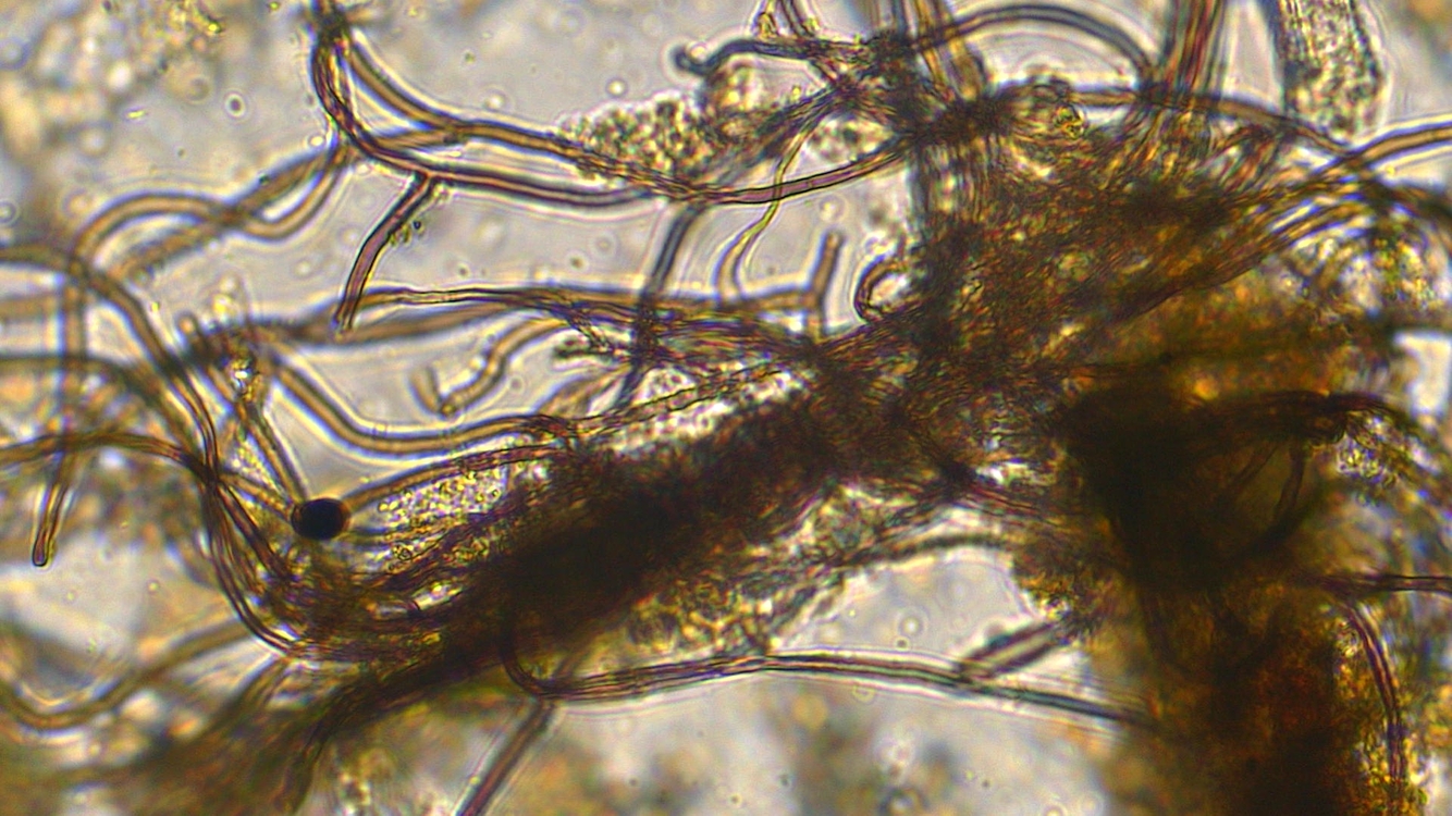 This particular species of fungi has dominated the organic material. It will be considered an outlier if it lands in a FoV unless every fov has whefts of fungi. Massage the sample, shake again, make a new drop to make sure this is common to the soil. Hyphae in focus is 3.5-4 um