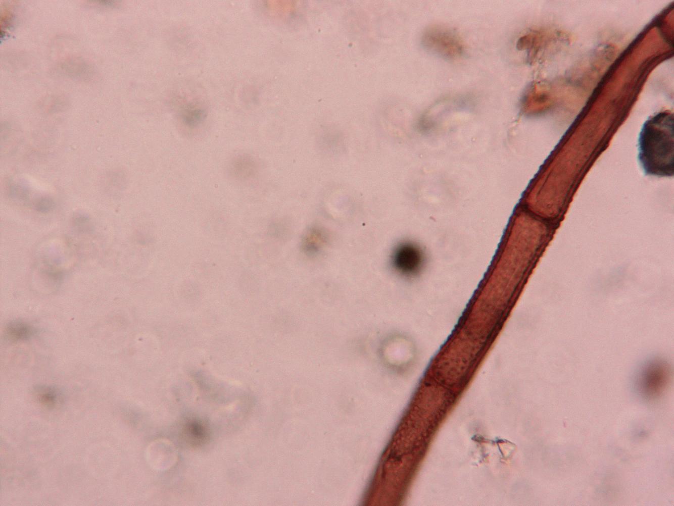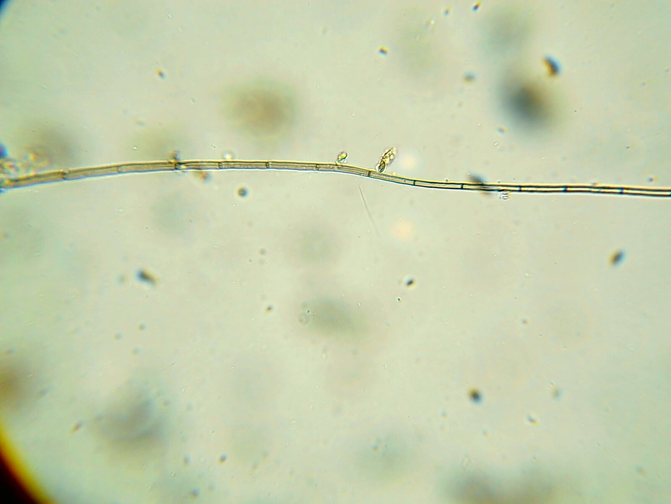 The upper section of the fungal hypha is out of focus therefore the position of the focal plane relative to the curvature of the cell wall creates the appearance of a line in the middle of the hyphae. Measurements: 0.58 Lenght / 4.5-5 Diameter