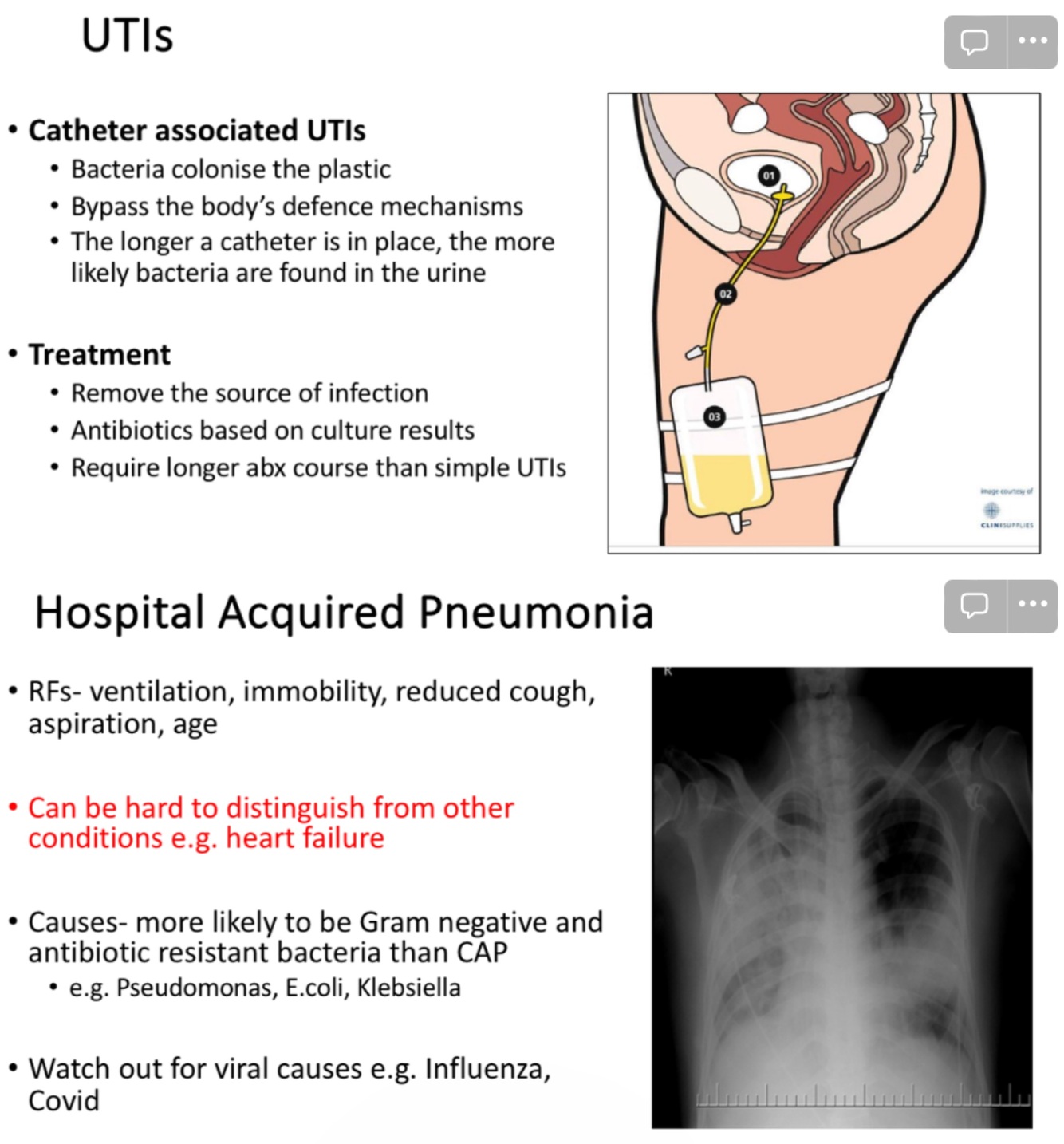 - Catheter associated UTI, hospital acquired pneumonia