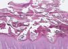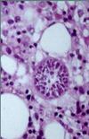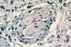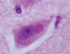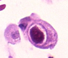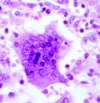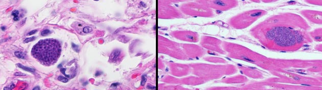 The latent form is represented by slow-growing protozoa forms called bradyzoites encased in cysts with a cyst wall. Multiple basophilic dot-like parasites can be seen in cysts