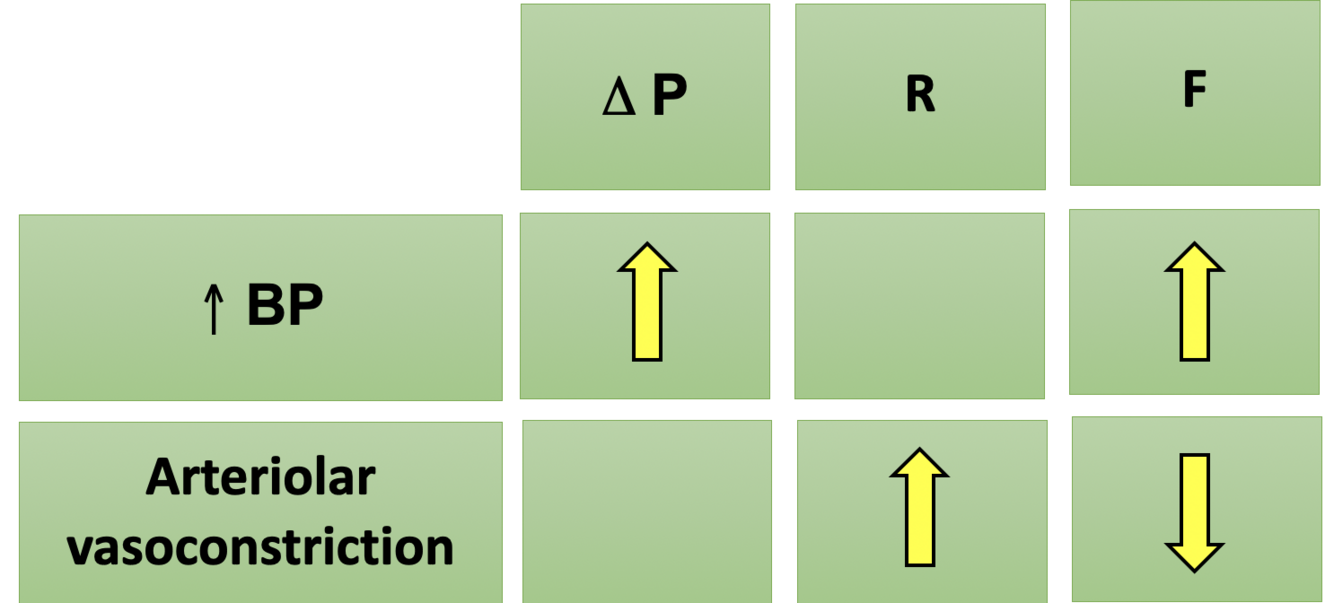 How does raised blood pressure / arteriolar vasoconstriction influence ‘deltaP, resistance and flow rate’