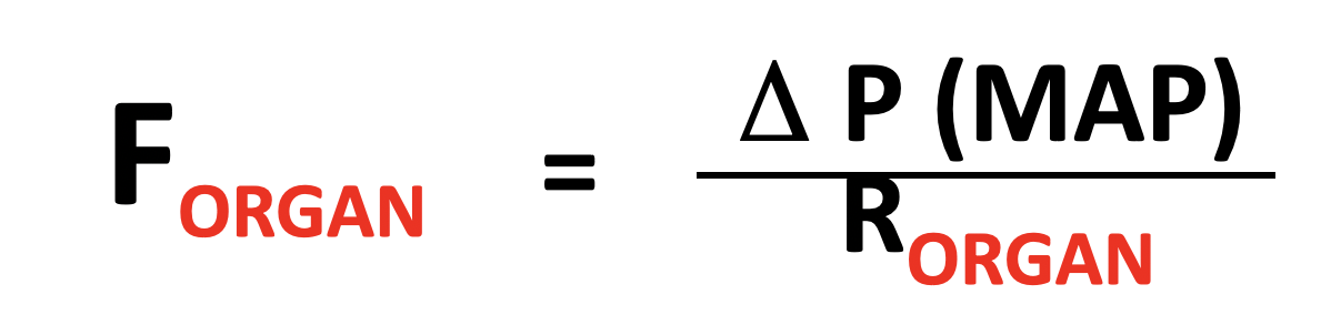 How can you mathematically relate blood flow rate, pressure gradient and resistance in an organ?
