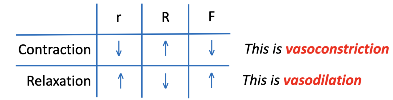 How does vasoconstriction/vasodilation affect flow rate, resistance and vessel radius?