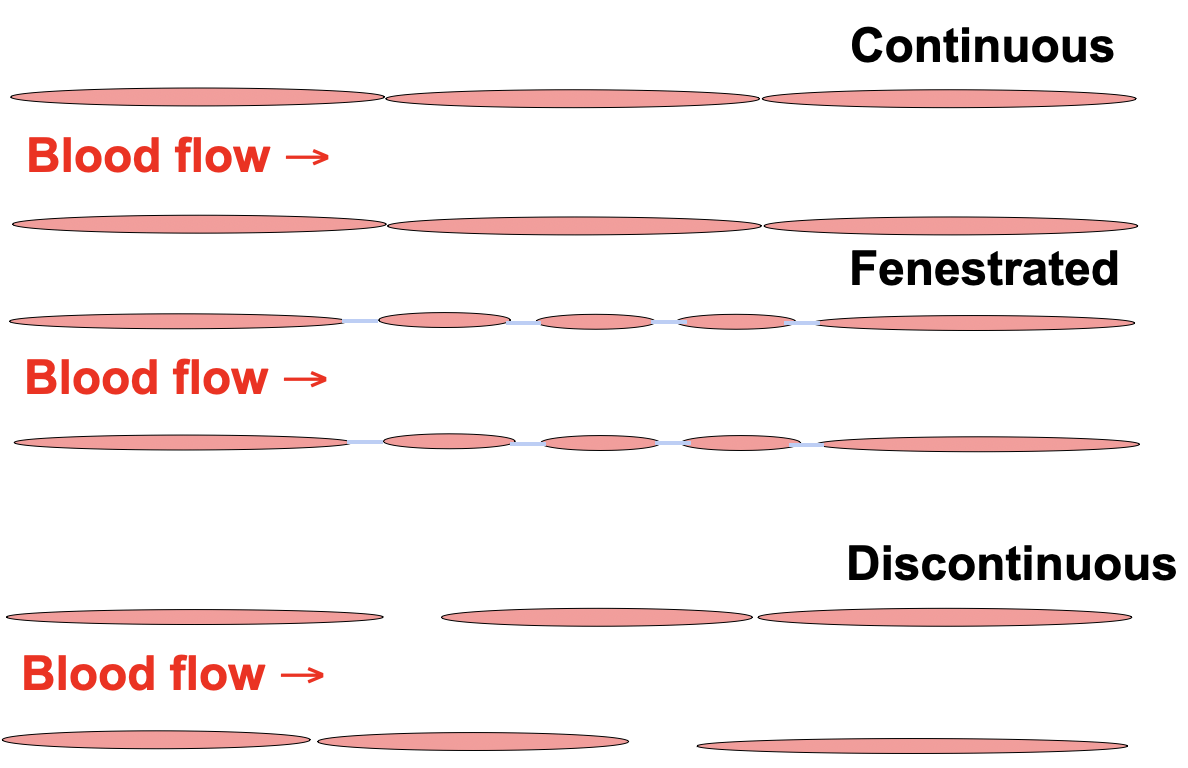 Discontinuous-Has open gaps between endothelial cells