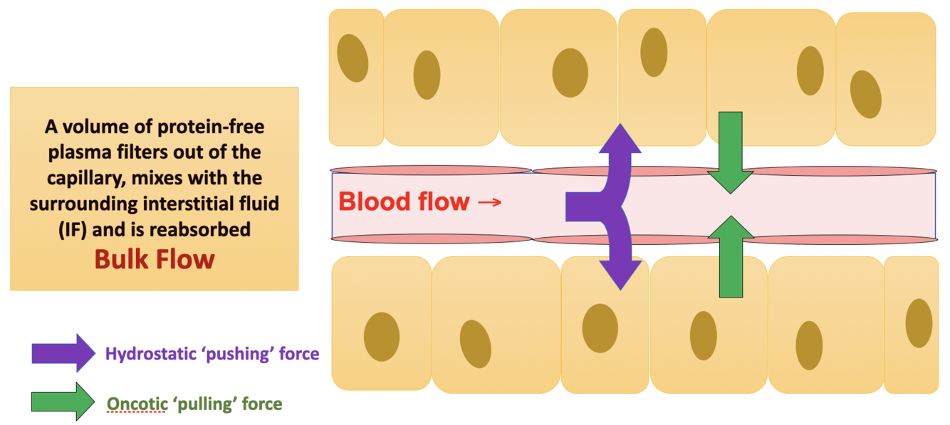 Outline hydrostatic and oncotic force in capillaries and what causes them