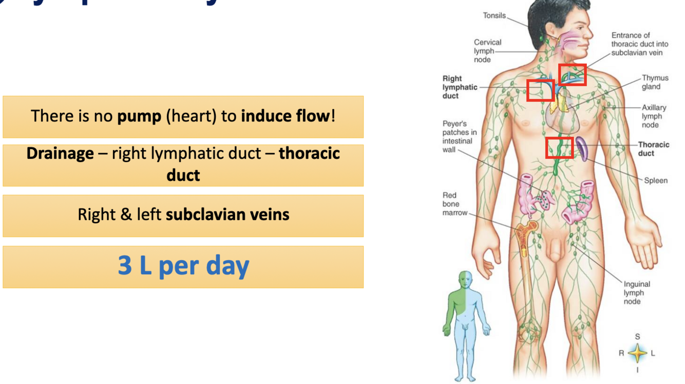 Give the general structure+main ducts+drainage capacity of the lymphatic system