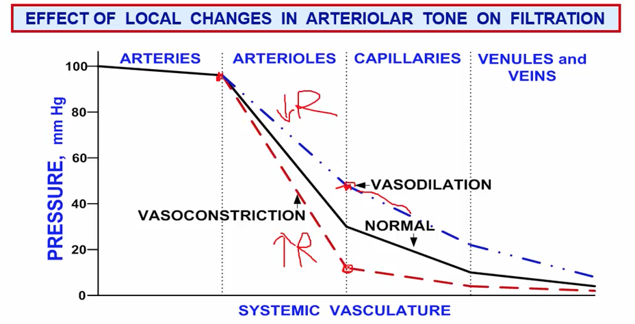 Within an organ when O2 is low precapillary sphincters open to increase blood flow to the organ to compensate for the low O2 levels. Capillary pressure also increases, number of perfused capillaries increases and hence the surface area for exchange of O2 increases.
