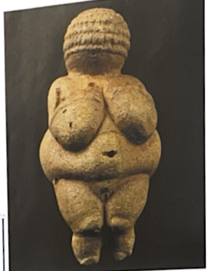 6) bulbous body, exaggeration of breast, abdomen, and hips. Head featured less, but arms have taken on greater importance. L arm draws attention to pubic area, and rasied arm hold bison horn. Similar to Venus of Willendorf. Meaning of gesture and horn still debated.