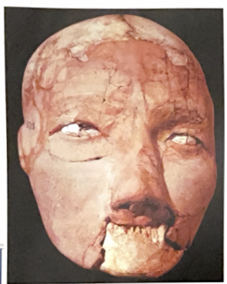 6) Human skull with restored features in plaster, shell, paint plastered skull. Purpose: serve a ritualistic purpose. Function was to honor and worship ancestors between the living and world beyond.
