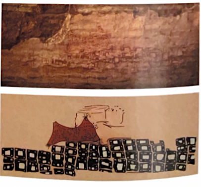 1) Landscape with volcanic eruption, wall painting is top and watercolor on botton (Level VII) (Fr. Catal Hoyuk, Turkey)