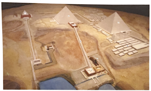 6) 3 major pyramids at Gizeh to serve as the tombs of the 4th dyn. kings Khufu, Khafre, and Menkaure. Also casueway, great sphinx, pyramids of the royal family and mastabas of nobles. Pyramids are symbols of the sun. Function: pyramids were where kings were reborn in afterlife, just as the sun is reborn each day. Also not only sereved as kings tomb but also his palace in the afterlife. 4 sides of the pyramids are oriented to the cardinal points of the compass.