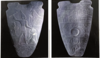 6) carved face, with defined nose, and chin, while the eyes and mouth are only minimally indicated, and the top of the head is covered with a grid-like pattern that may represent curly hair or a woven hat. Similar to Venus of Willendorf.