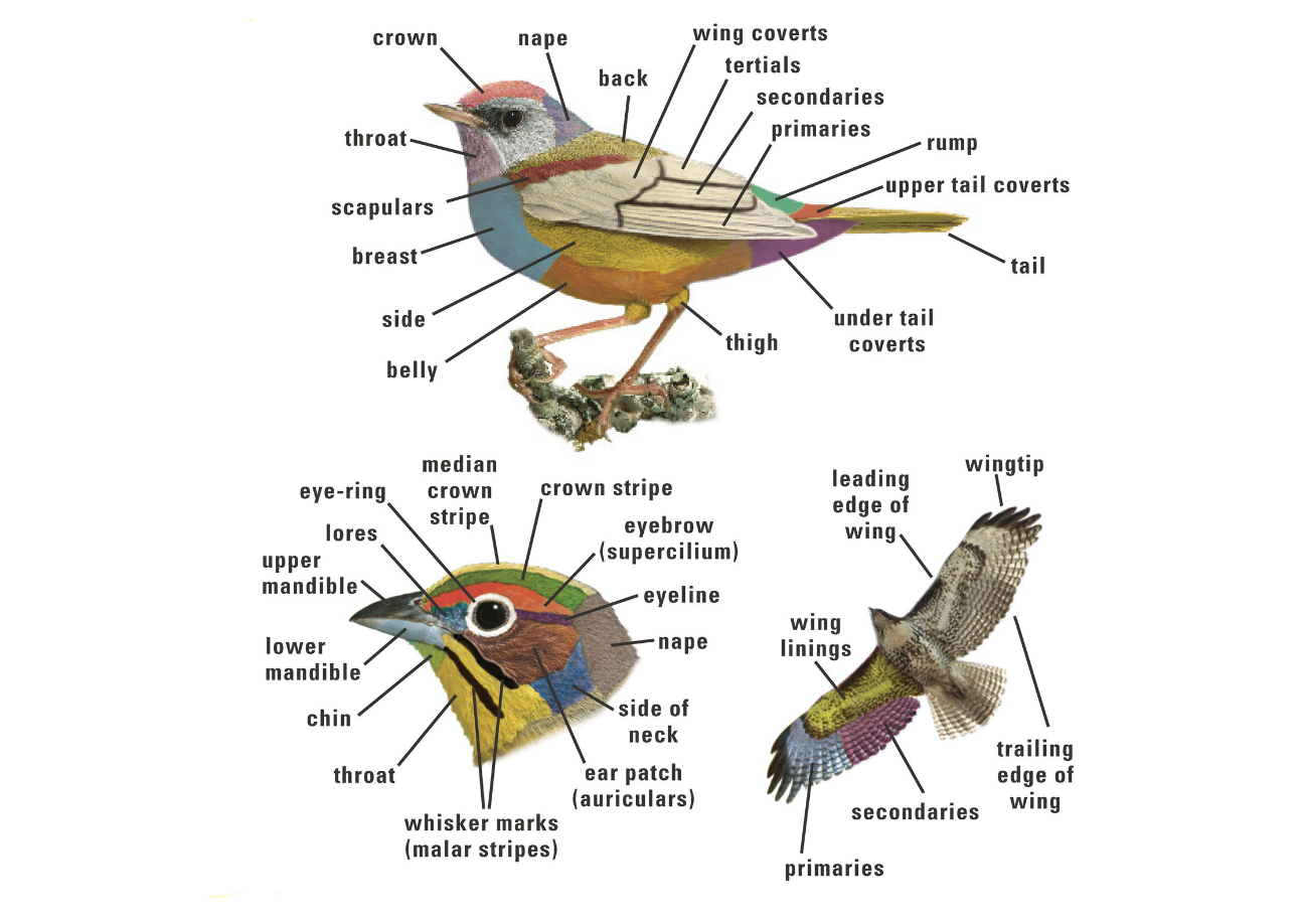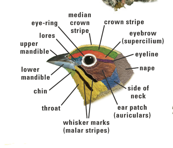 label a diagram of the head: eye ring, eyebrow, eyeline, nape, whisker marks, throat, chin, upper and lower mandibles, crown stripe