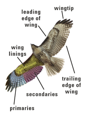 label diagram of wings In flight: primaries, secondaries, wingtip