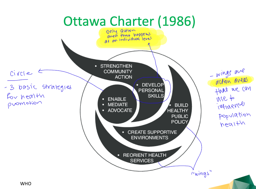 The Ottawa Charter for Health Promotion (1986) was developed at the first international conference on health promotion and focused on broader social, economic, and environmental factors