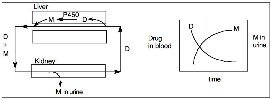 Refers to when a drug is converted to a metabolite in the liver. Bile Canaliculus and hepatic vein are the two ways a drug and its metabolite can exit the liver.