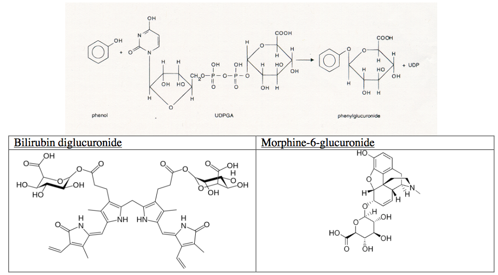 microsomal enzyme. polar group on drug/metabolite + UDPGA –> glucuronidated drug/metabolite + UDPG. UDPGA is a co-substrate. get inversion at oxygen (R-O-R’) group and the oxygen on the product glucoronide is from the original metabolite/drug.