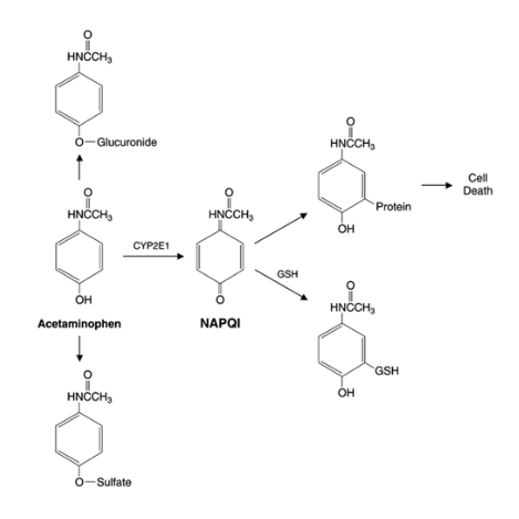 glucuronidation and SULTs are major elimination pathways. Also have CYP2E1 that converts APAP to NAPQI which is a highly reactive electrophile. GSH reacts with NAPQI to form mercapturine and excretion. But if GSH levels are saturated NAPQI will start reacting with proteins and cell death will occur. Alcohol induces CYP2E1 that is why you never take APAP and alcohol.
