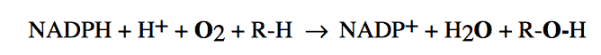 P450 catalyzed reaction where molecular oxygen is bound by heme group and one oxygen eventually is incorporated into the substrate and the other is converted to water.